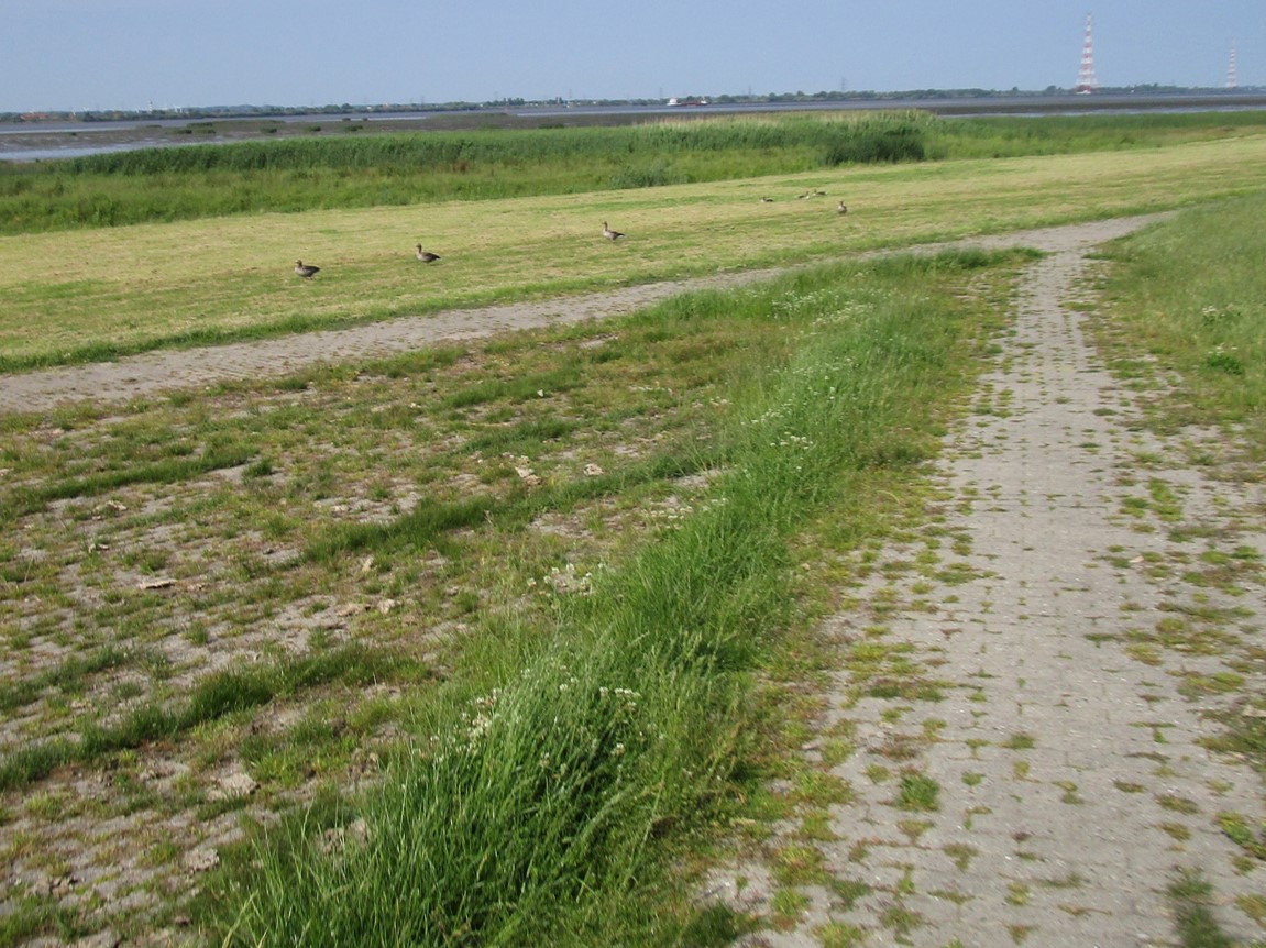 Was tut der Mensch … – links Kiesdepot mit Lenkbuhne, rechts Radler.