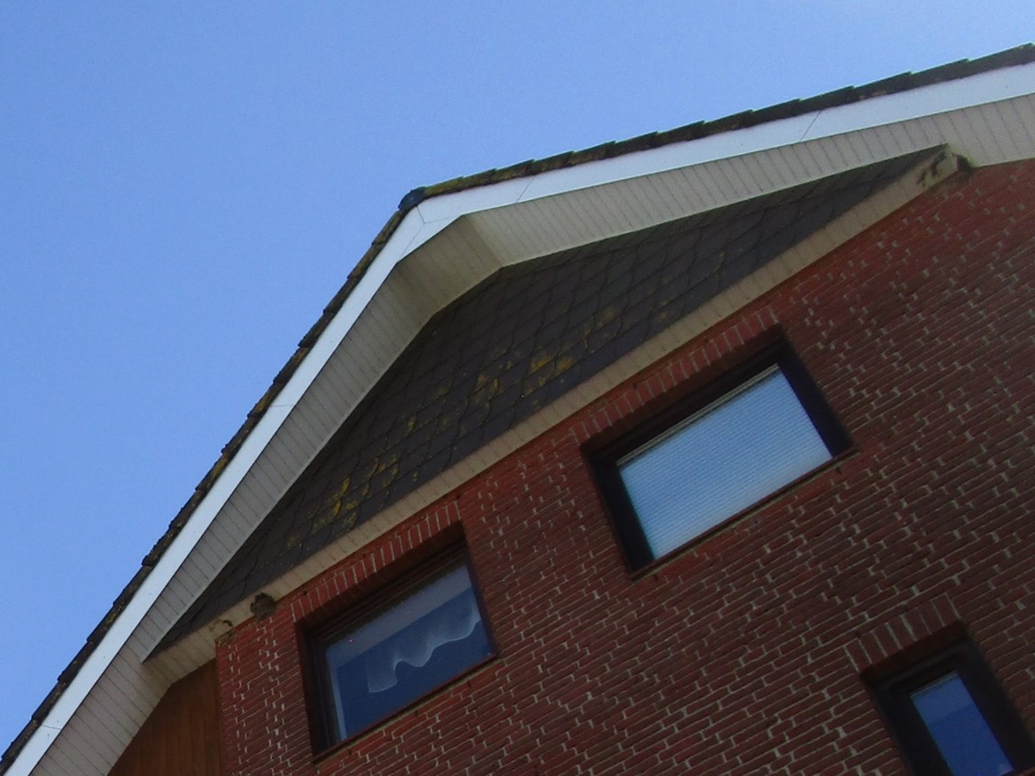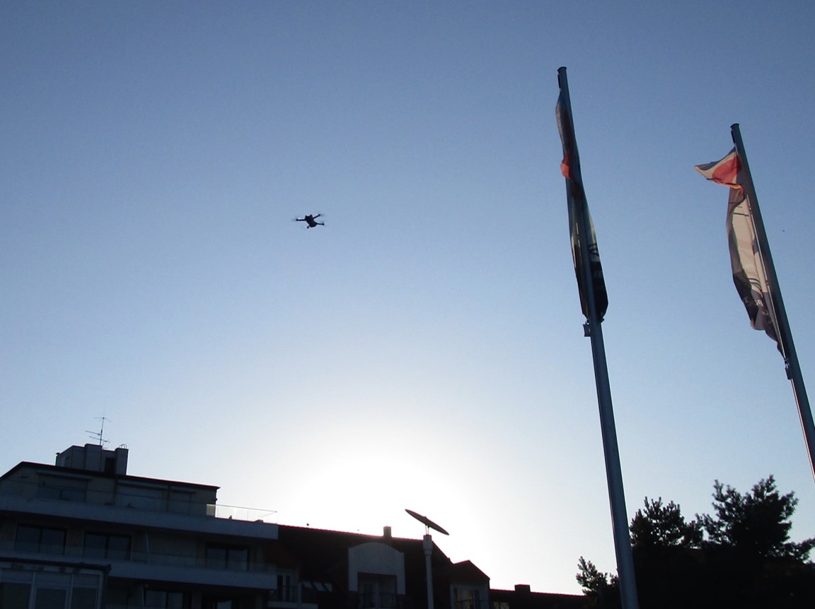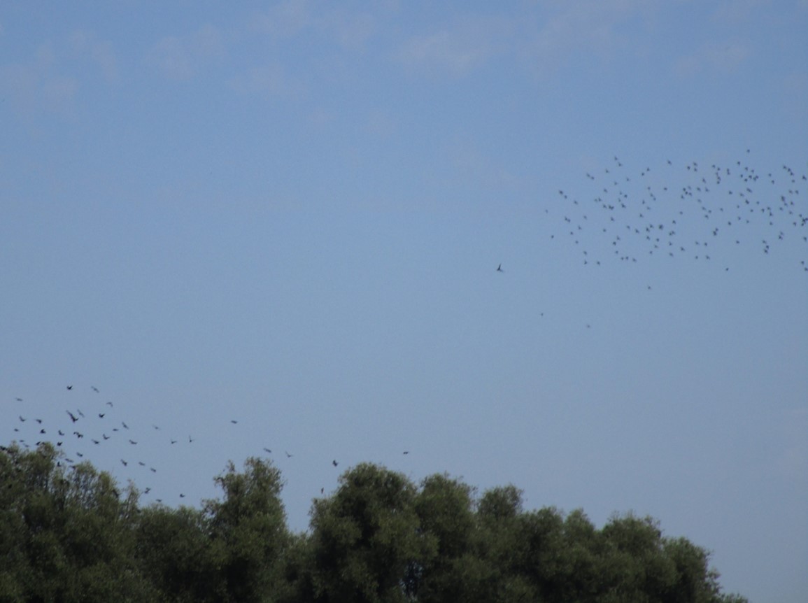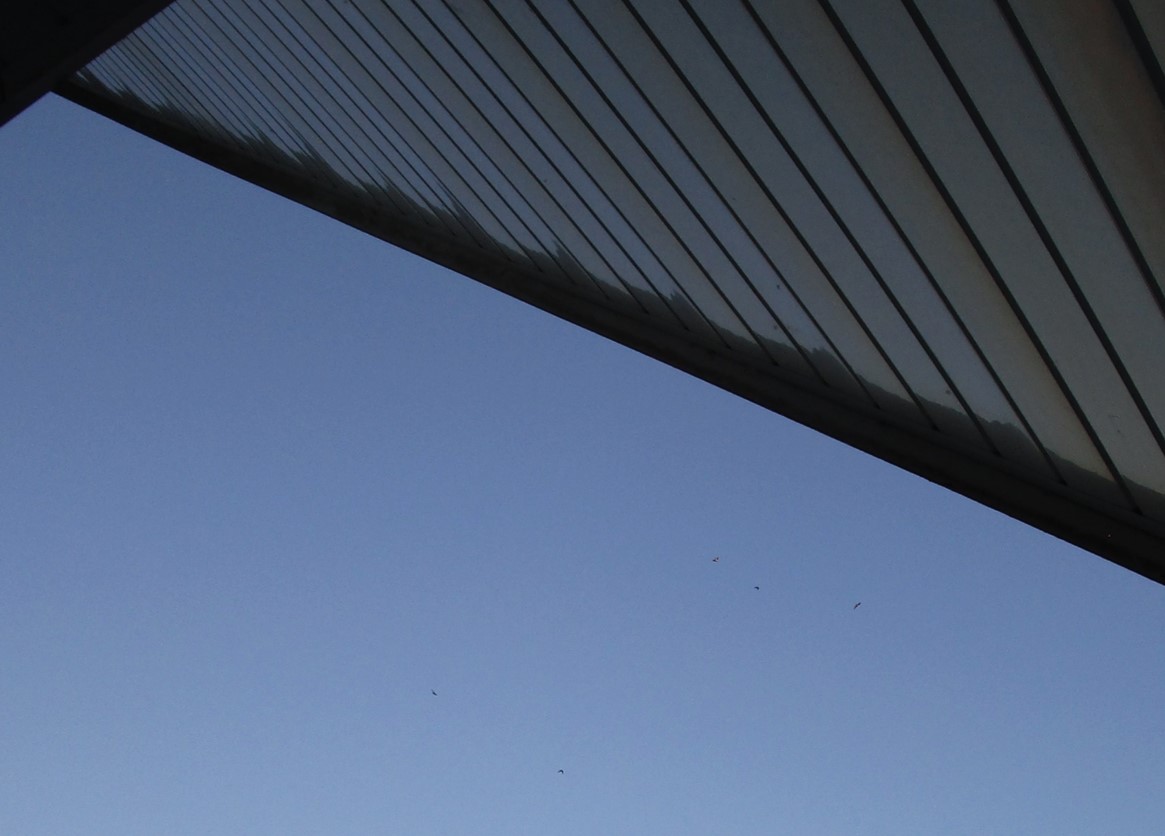 Nein, die kleinen Punkte sind keine Mücken, sondern Youngster und Eltern der Mehlschwalben, die ihre abendlichen Trainingsrituale in Nestnähe für den baldigen Südflug absolvieren.