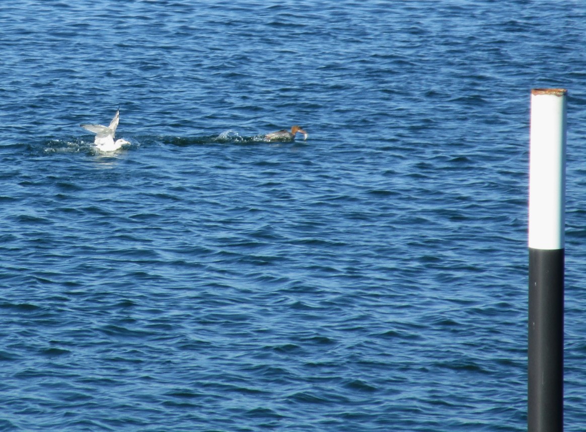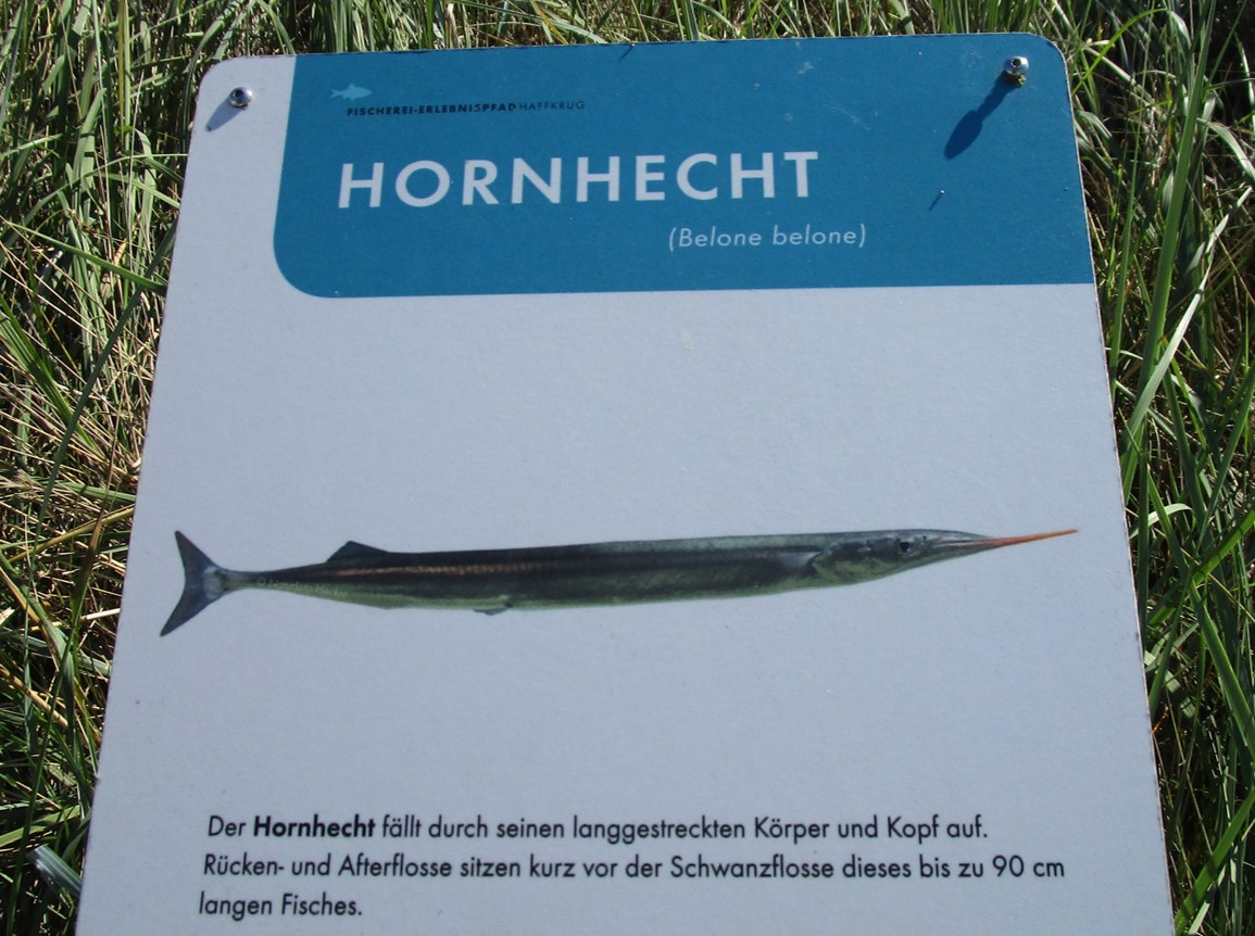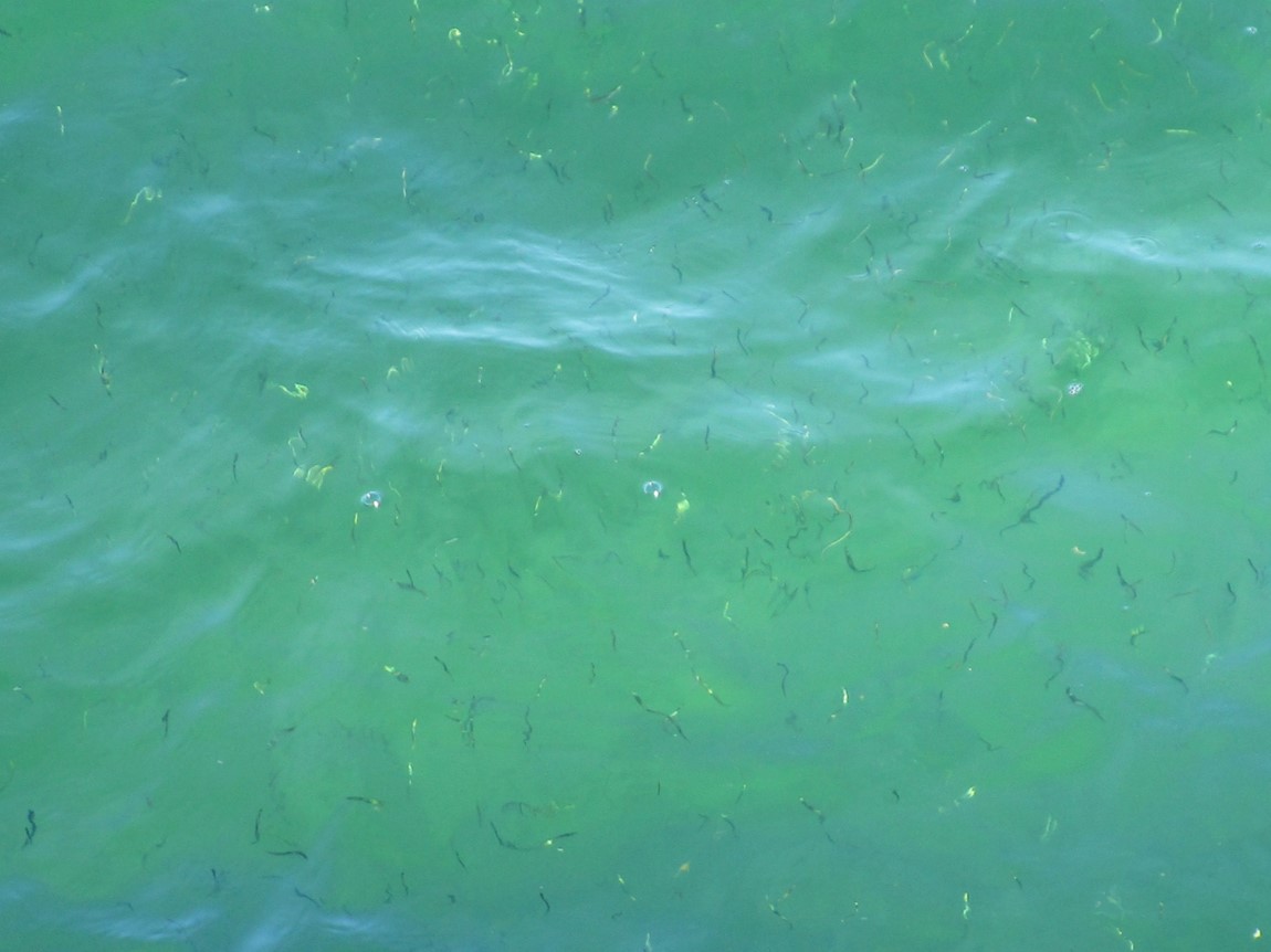 Fachkollegiales Gespräch bestätigte die Richtung meiner Vermutungen. Die höchstens 1 cm langen, un“greif“baren Glitzerdinger sind wahrscheinlich Heringe. Da die ca. 4 cm langen, gut erkennbaren Fischchen nicht „stab-„, sondern fast schlangenförmig herumwirbeln, halten wir die nicht für Hornhechte, sondern für Sandaale (ACHTUNG: die sind keine Aale, genau so wenig wie die oft begrifflich in den Mund genommene Aalmutter). – Gelegentlich schwimmt in den unglaublichen Jungfischschwärmen ein bei ca. 30 cm Länge noch junger Hornhecht vorbei – die nächste(n) Speise(n) ausgucken?