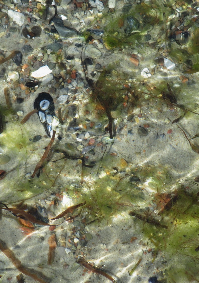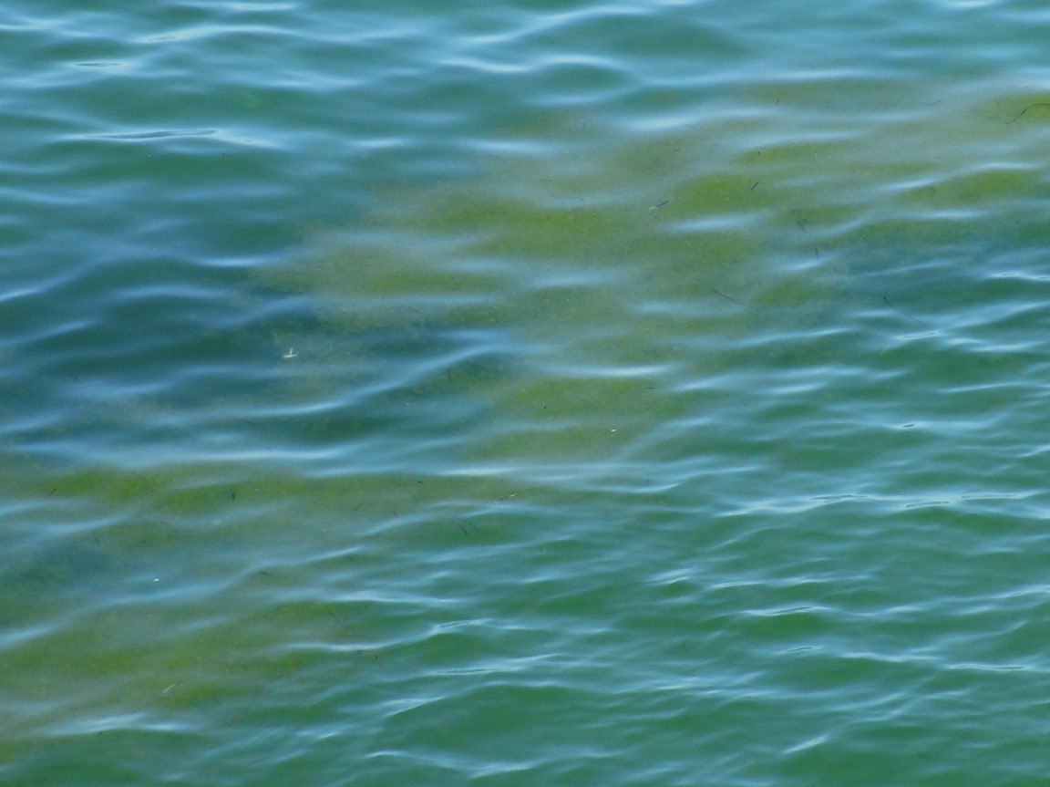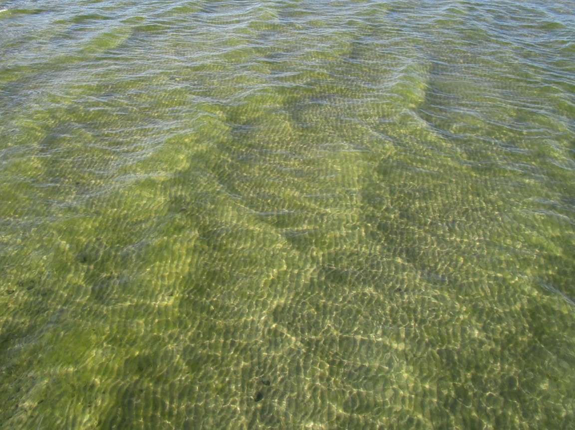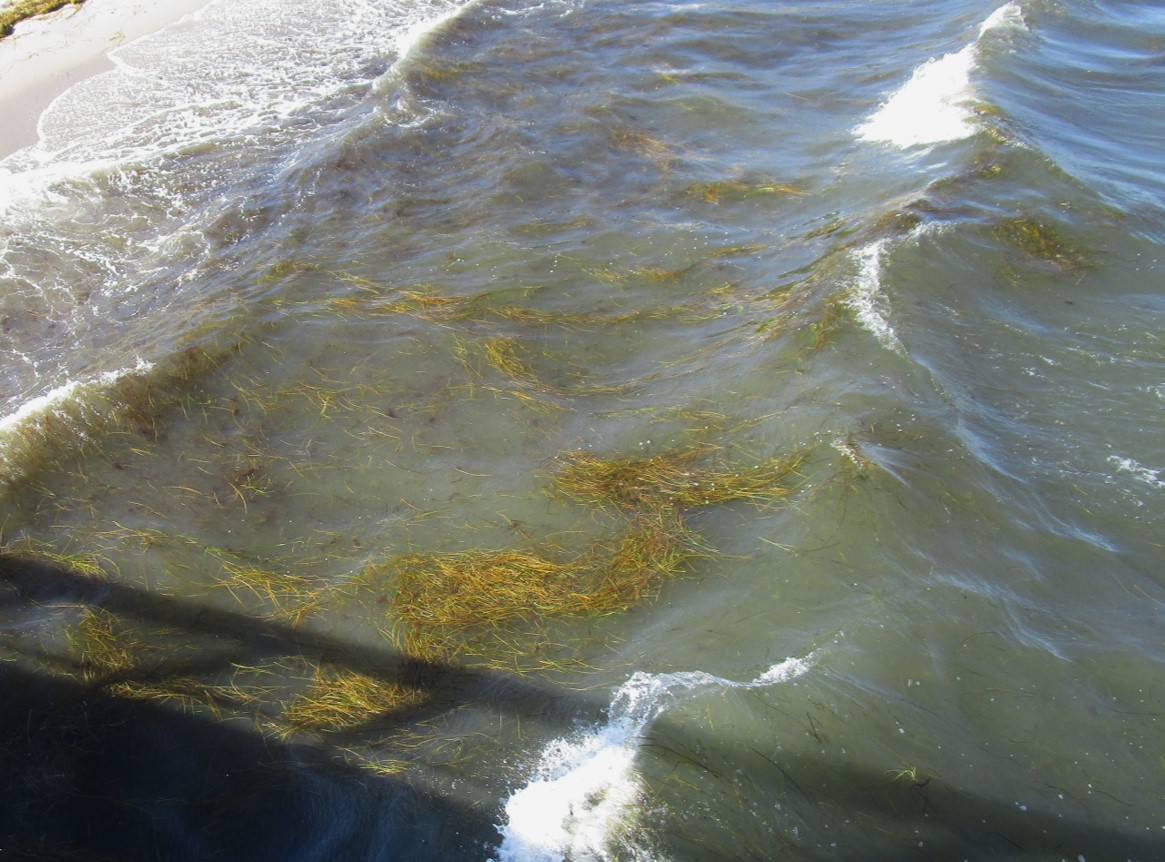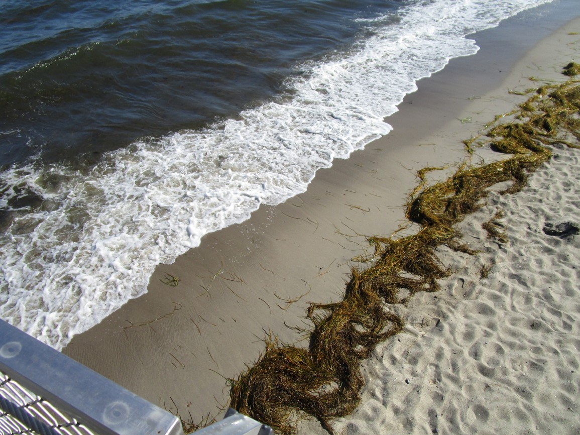 Angesichts recht ruhigen Wassers und schwach ablandigem Wind hält sich abgerissenes Seegras gut sortiert „draussen“ auf.