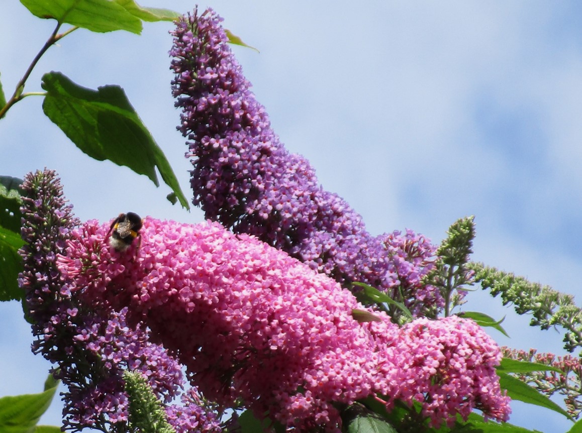 Die meisten Schmetterlingssträucher ringsum sind über stürmisch-, nasskaltes Wetter in ihrer Blüte weit vorangeschritten, viele fast ganz verblüht.