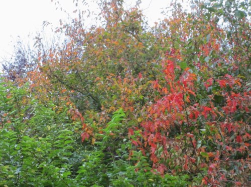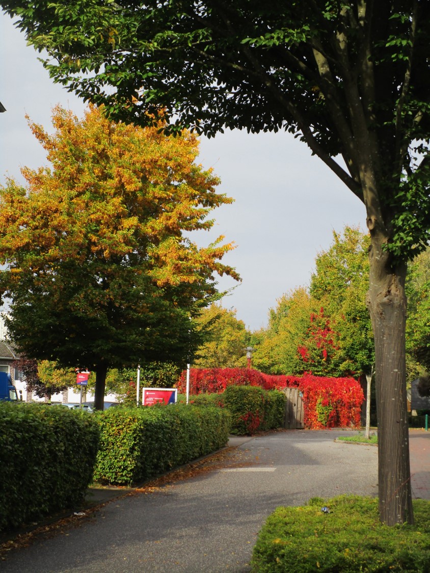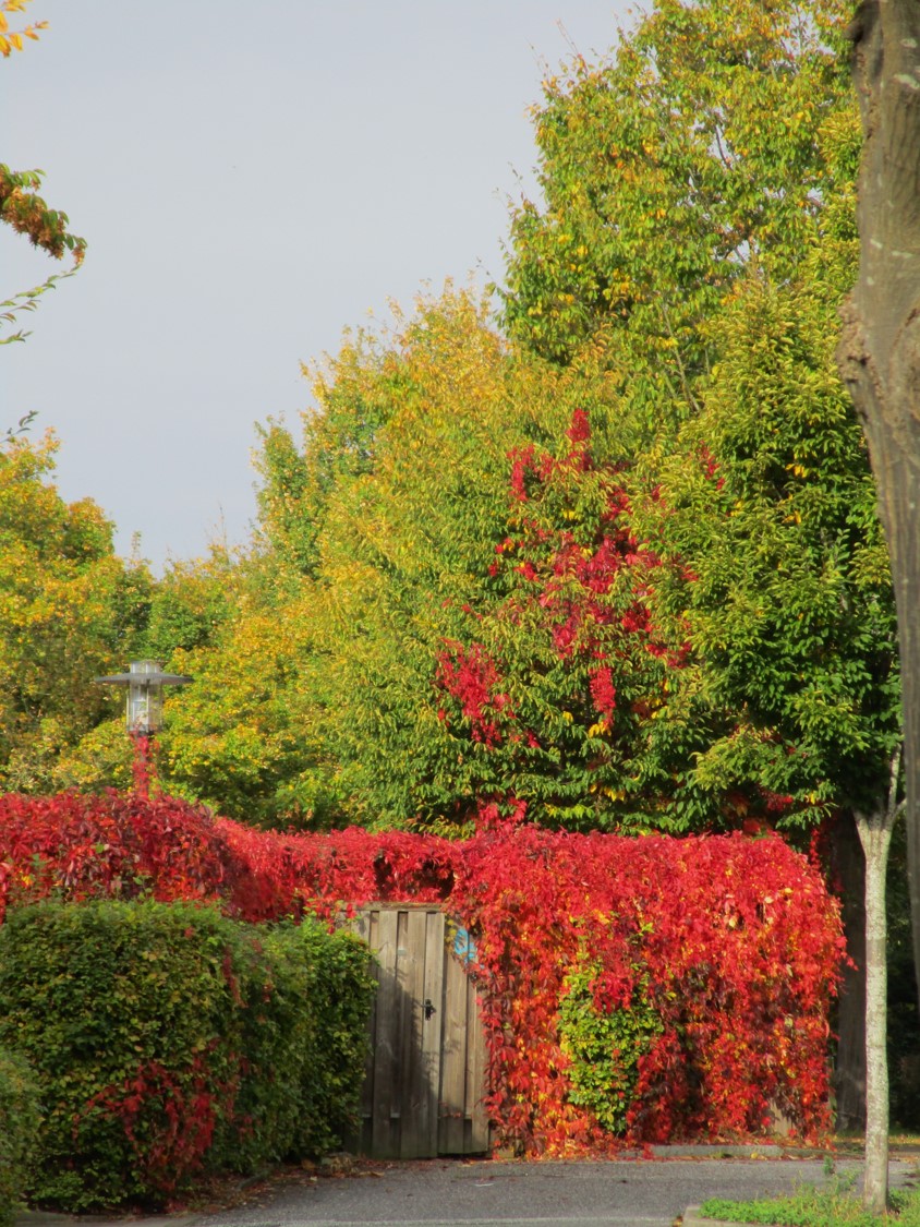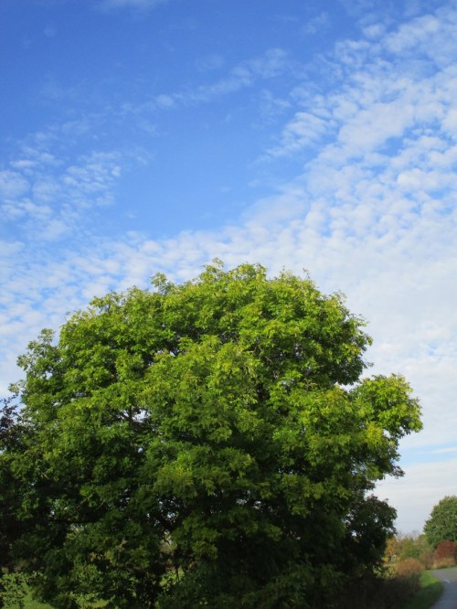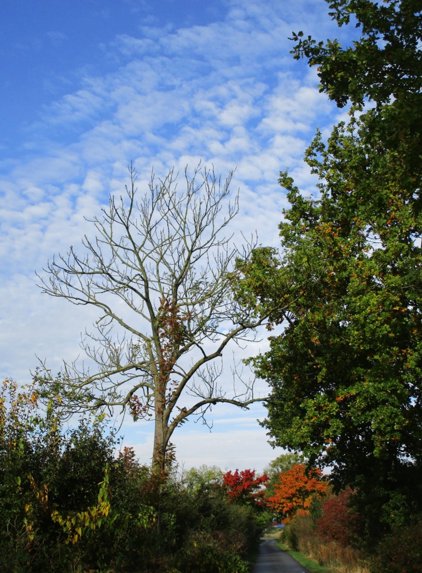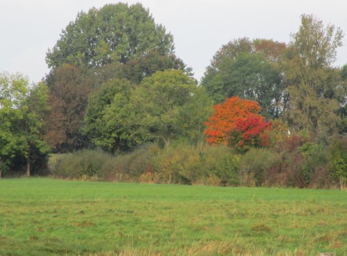 Blick von Idenburg gen Hetlingen – inmitten Eichen-, Eschen-, Pappel- und Ahorngrün steht singulär schon etwas Knallrotes.