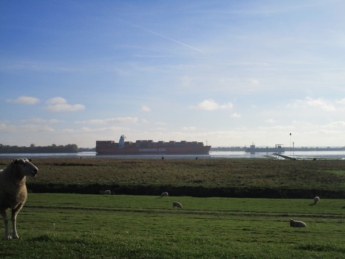 Deichschaf auf der Deichkrone, mittlerer Containerfrachter und Großsaug- und -klappbagger auf der Elbe bei Fährmannssand, Tnw.