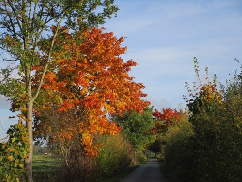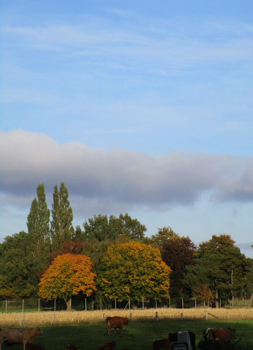 Blick vom Radweg entlang B 431 – hinter Weide und abgeerntetem Maisfeld Herbst-Ensemble aus Pappel, Hain- und Buche, Eiche.