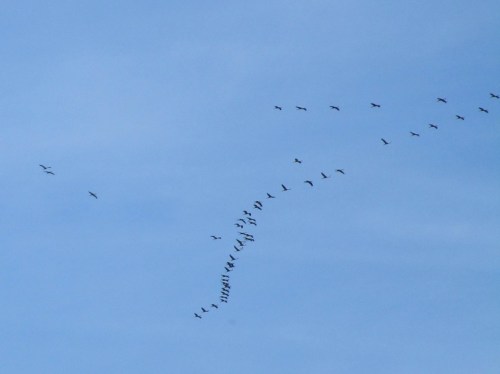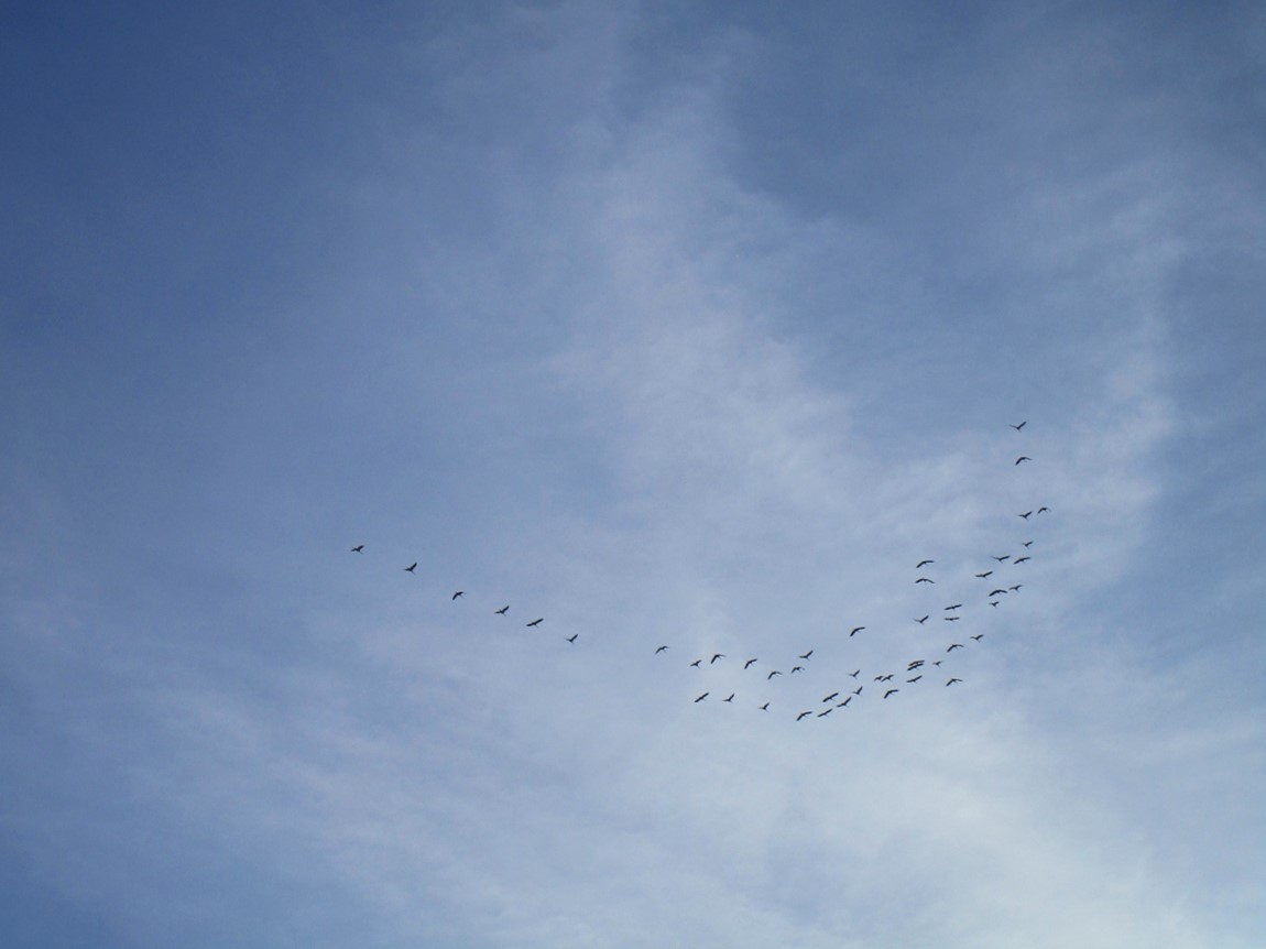 Auf dem vorigen Foto bereits vermutbar, haben die Tiere ihre Richtung geändert, fliegen auf mich zu, orientieren und formieren sich über mir neu …