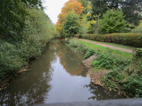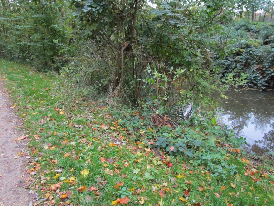 Vorbei am Buchenbogenkies (bunter Baum hinten im Bild, vgl. vorletzter Bericht) gehe ich um die auch rechtsufrig baumbestandene Kurve.