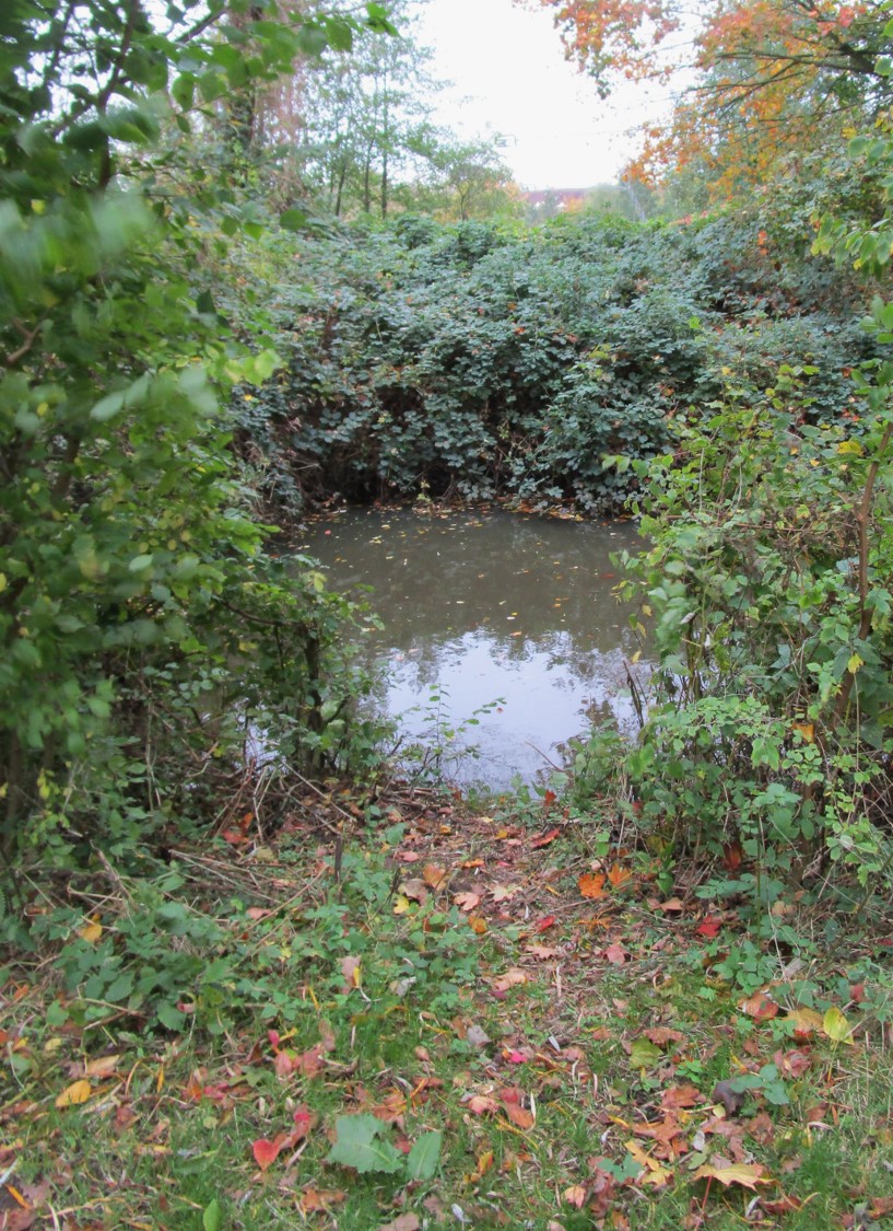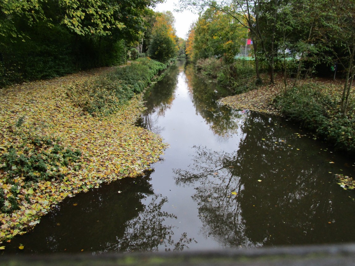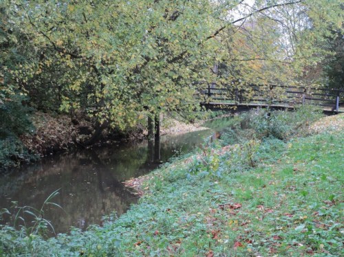 Der Niedrigabflussaspekt wird durch das Herbstlaub verstärkt. Je nach Höhe des seit gestern durch fast Dauerniederschlag bewirkten Abflussanstiegs wird sich nach Abklingen ein interessanter, veränderter Bachanblick zeigen.