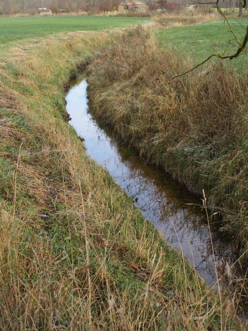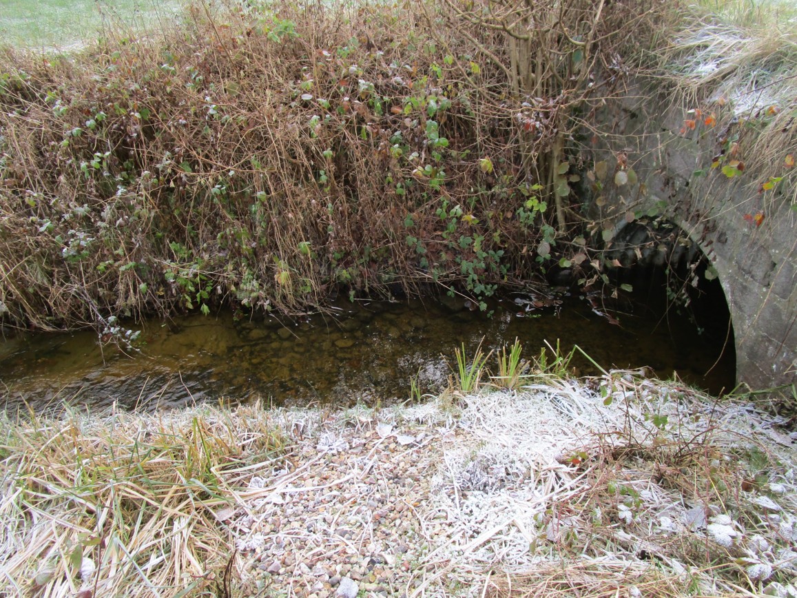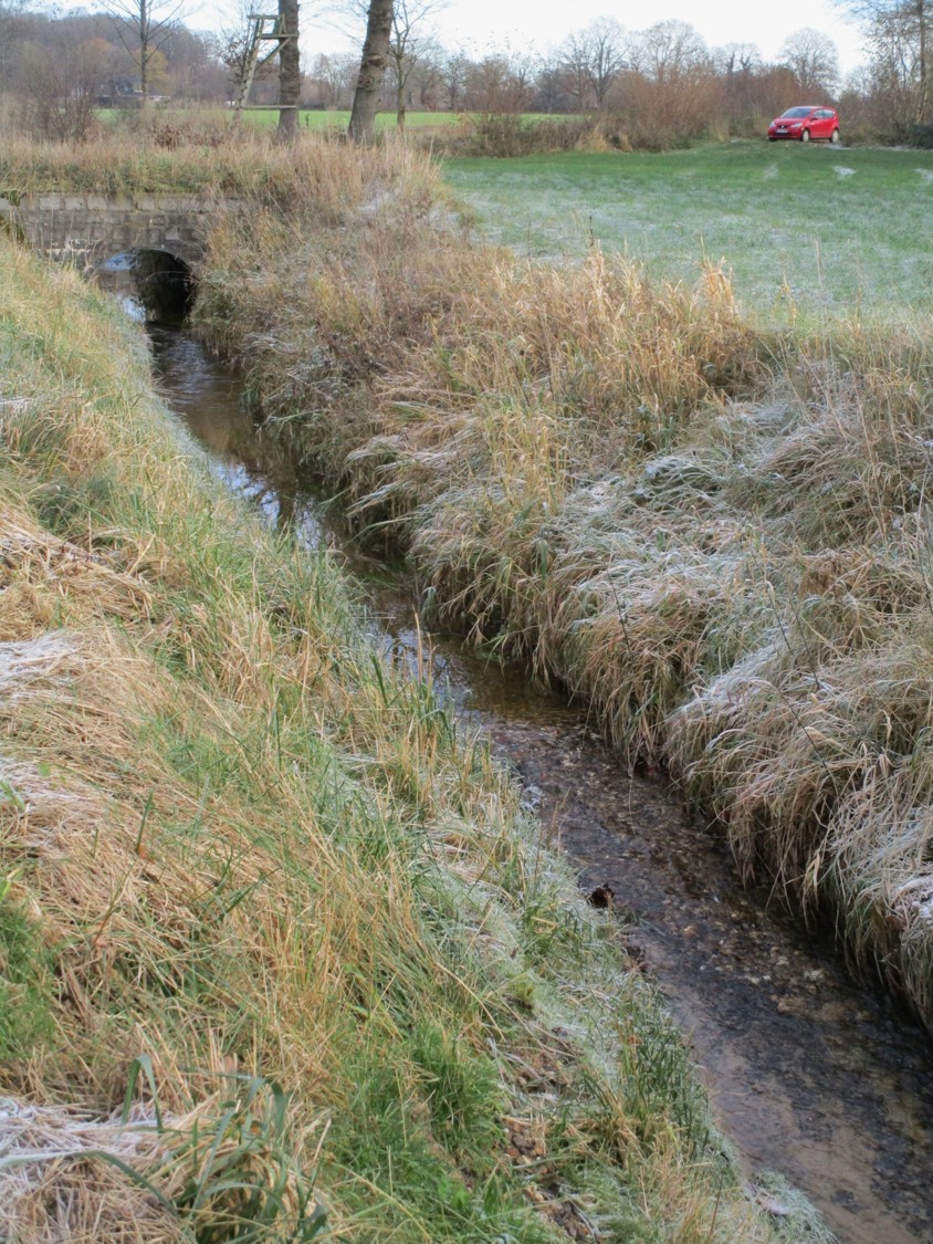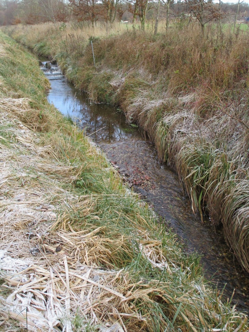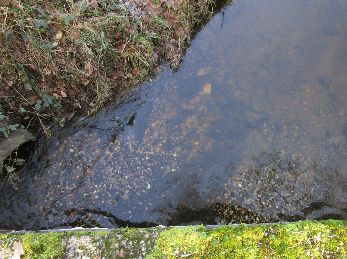 Extrempunkt Reiterfurt, Abfluss bachab nach rechts – das lebensfeindliche, menschengemachte Kastenprofil hat punktuell durch beidseitige Eineingung und Sohlaufhöhung mit Kies neue Struktur erhalten – die Rausche rauscht.
