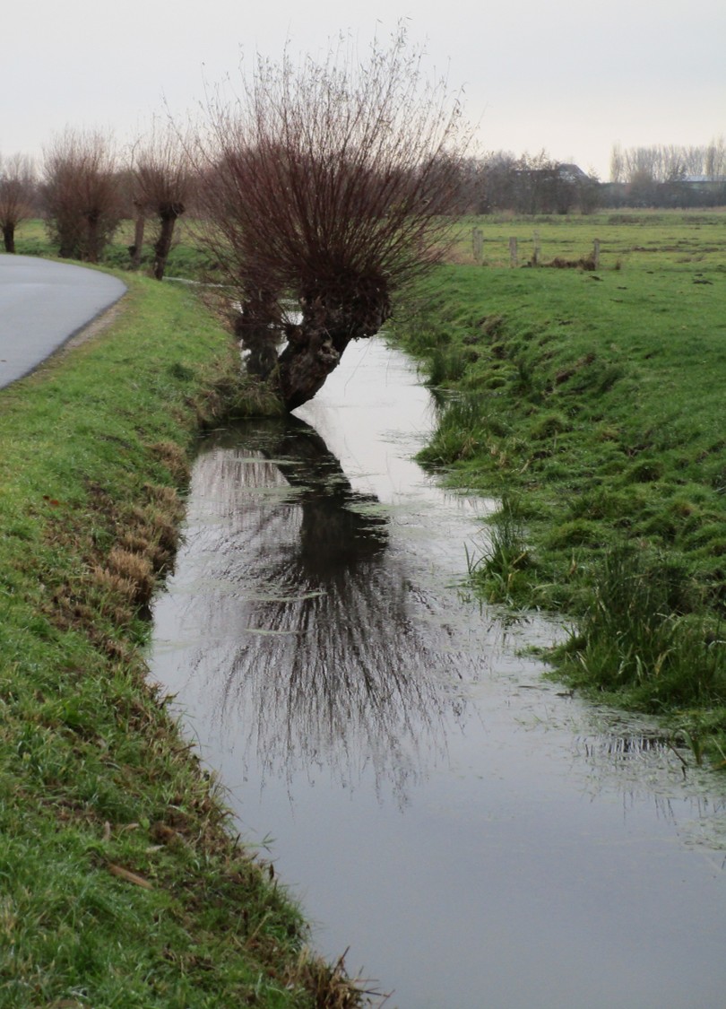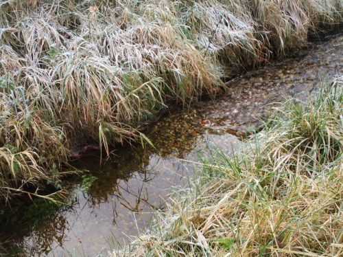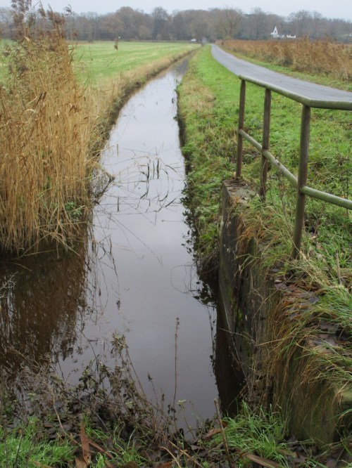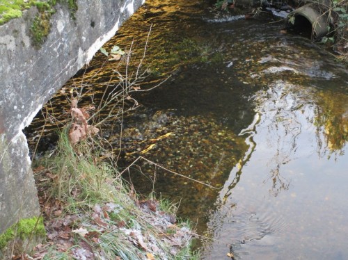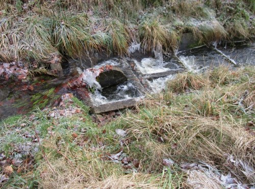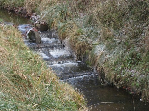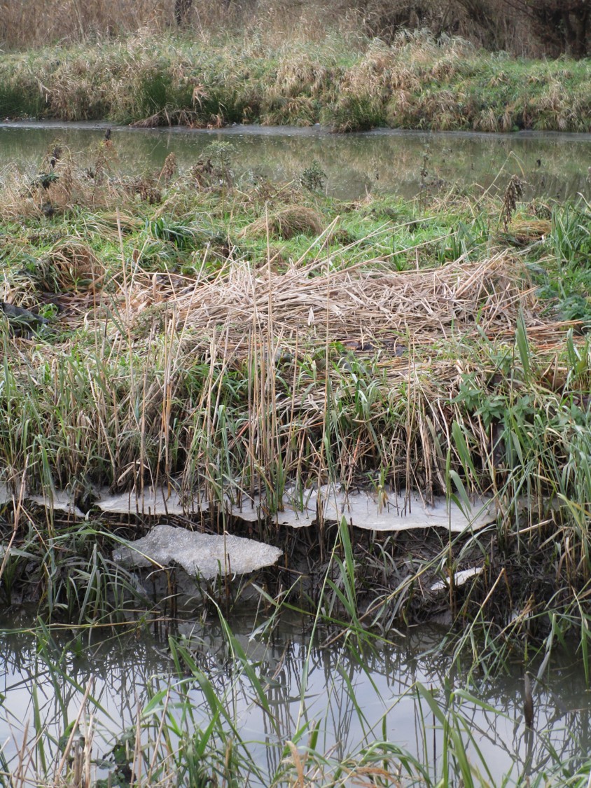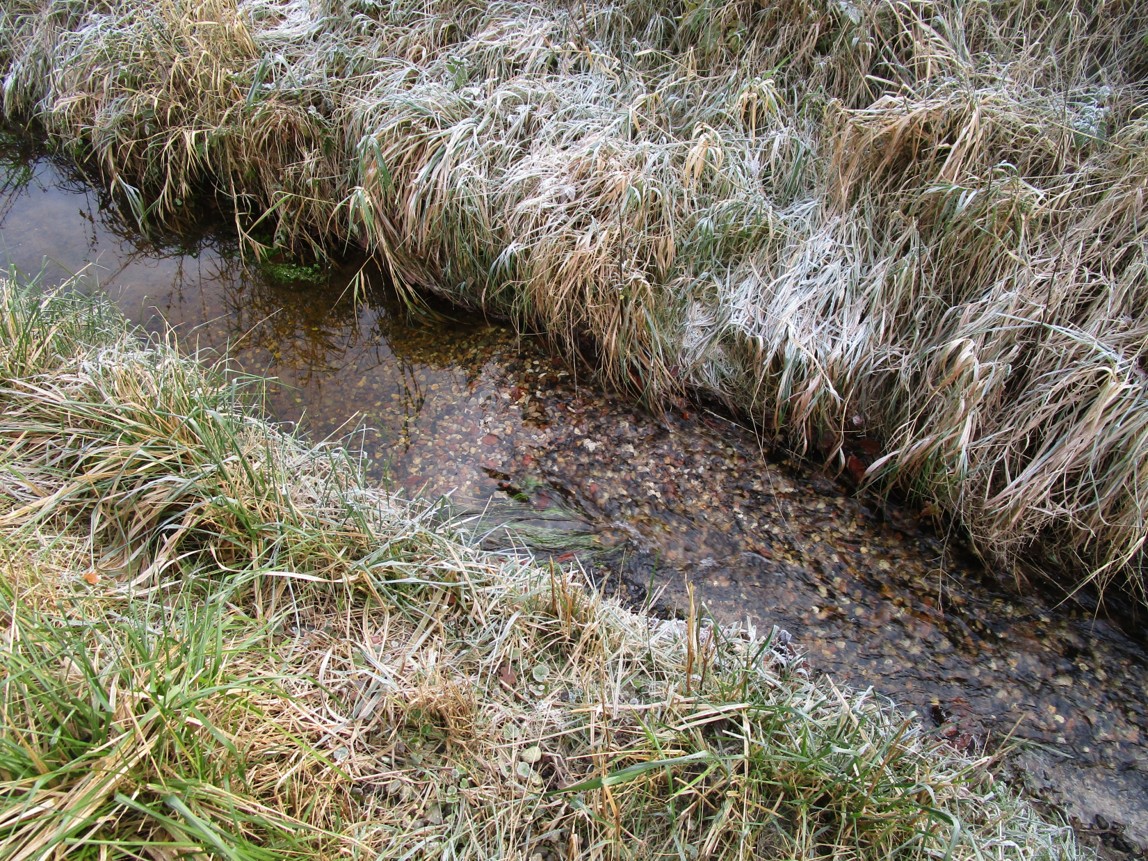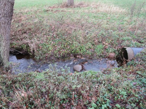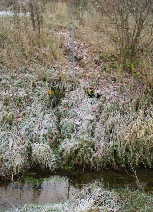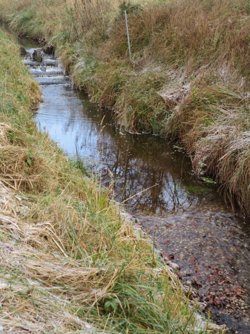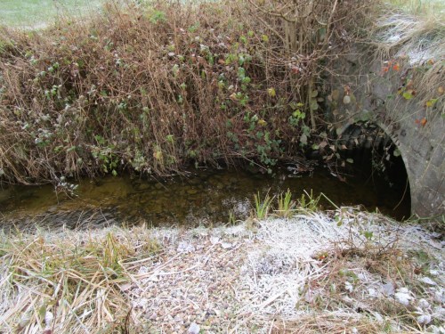 Extrempunkt Reiterfurt, Abfluss bachab nach rechts – das lebensfeindliche, menschengemachte Kastenprofil hat punktuell durch beidseitige Eineingung und Sohlaufhöhung mit Kies neue Struktur erhalten – die Rausche rauscht.
