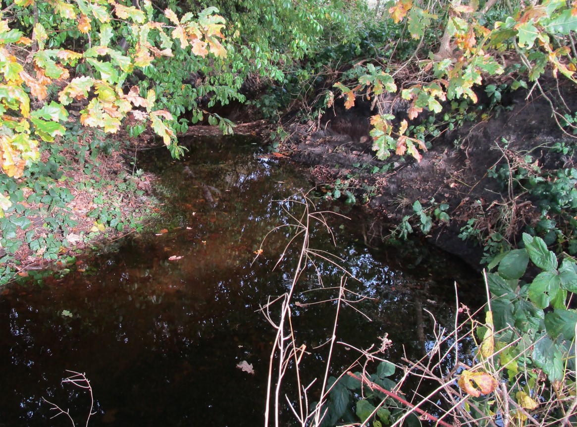 Andere Straßenseite – leicht eingestaut fliesst der gewesene Regen durch hiesige Besonderheit: (2) Mäanderbögen, die im Abflusswechsel das Jahr über Bachdynamik ablesen lassen.