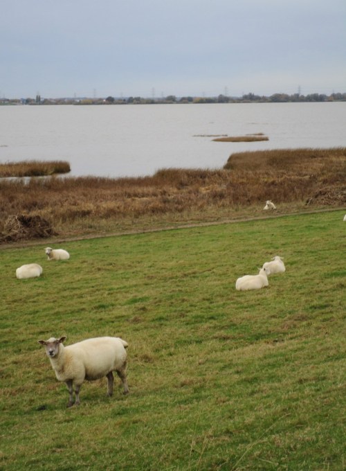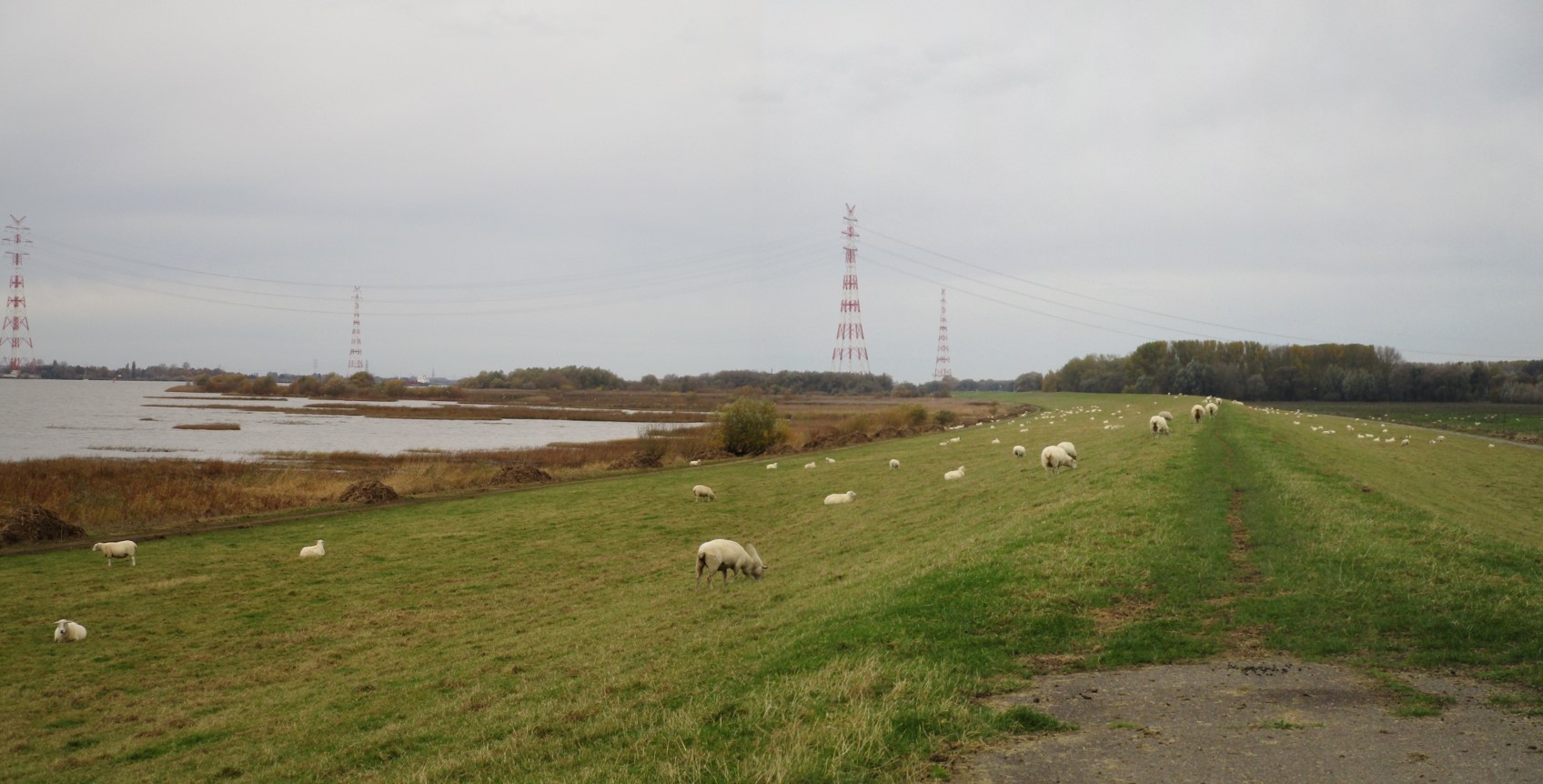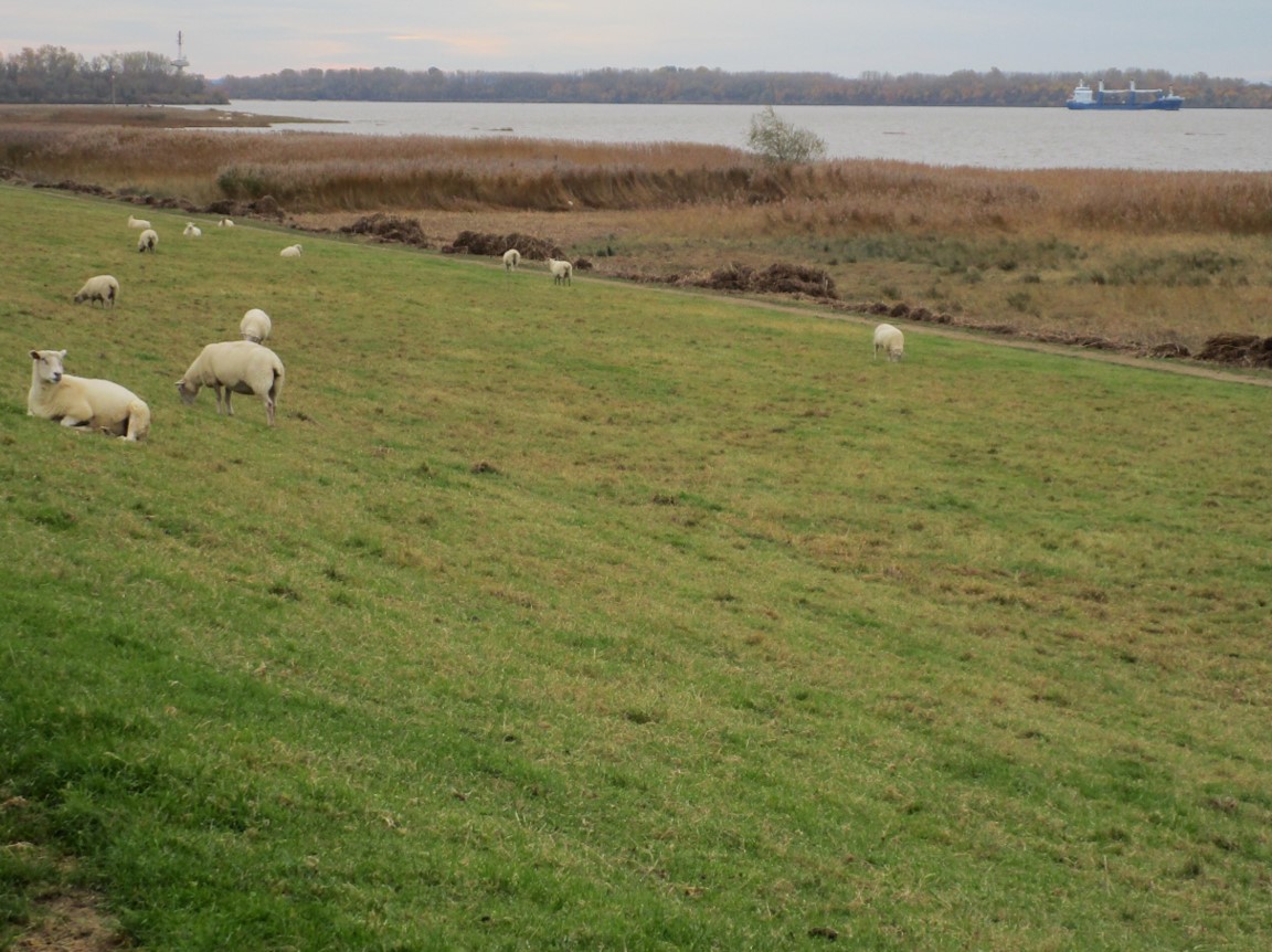 … allerhand Reet losgerissen. Haufenweise liegt es von der äusseren Deichverteidigungsstraße abgeräumt Elbe-seitig (mittig Artefakt: Doppelkopfschaf, nicht im Fotoverkoppeln korrigiert 🙂 ).
