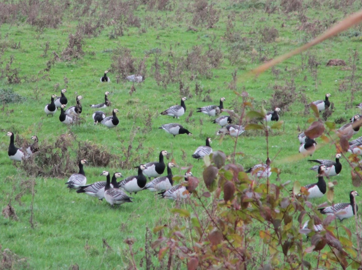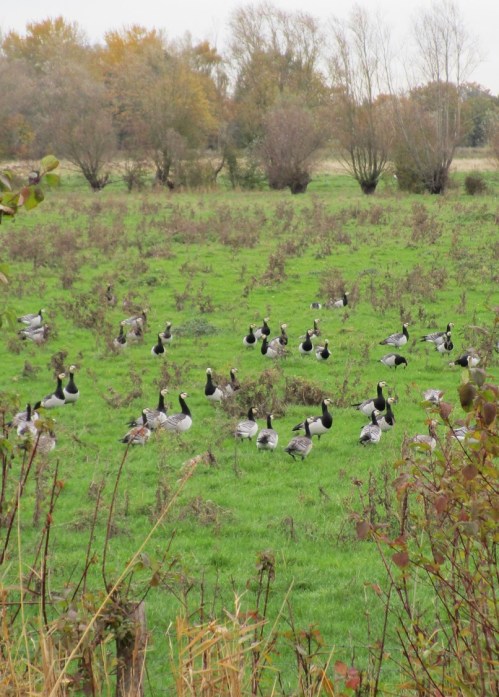 Nonnengänse, mal nicht hochgescheucht – ich stehe halbverdeckt von Stauden. Die aufmerksam gewordenen, zum Wegwandern gestarteten Tiere …