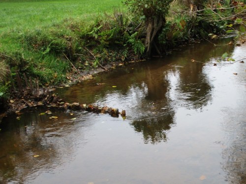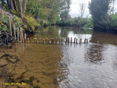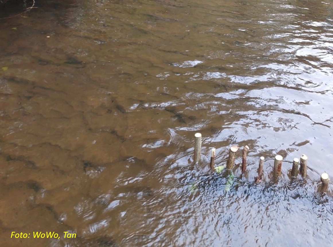 Blick aufwärts, 2 Treibselsammler stehen bereits – gut erkennbar die dichte Einbindung, hoch ins Ufer, sowie ansonsten die Mittelwasserhöhenpositionierung, damit höhere Abflüsse freien Lauf haben.