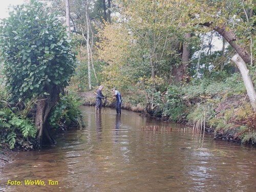 Voriges Jahr hatten wir uns an der Gronau, einem Bach im Pinnau-Einzugsgebiet, eine extrem überbreite, strukturlose und von bewegtem Sand gekennzeichnete Strecke angesehen. Dort sollten „Hölzchen & Stöckchen“ als Treibselsammler den Querschnitt einengen, den Sand umlagern und die Sohlstruktur verbessern sowie antreibend gesammeltes Material als Speisekammer und weiteren Kleinlebensraum bieten.