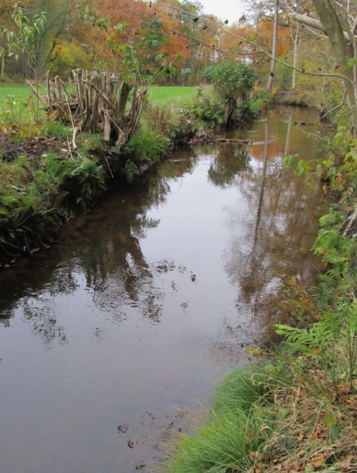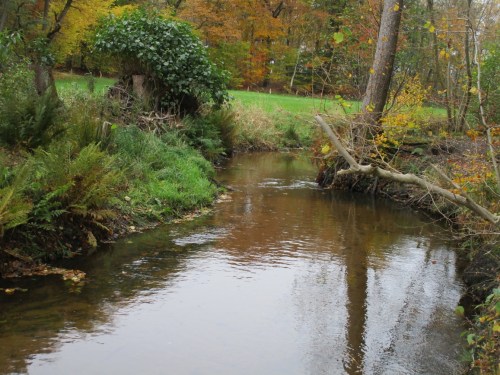 Blick bachab auf die „funktionierende“ Gronau – weniger als die halbe Breite, gehalten von hoffentlich weiter gefördertem Baumsaum, kennzeichnet den strukturreichen, lebendigen Bach.