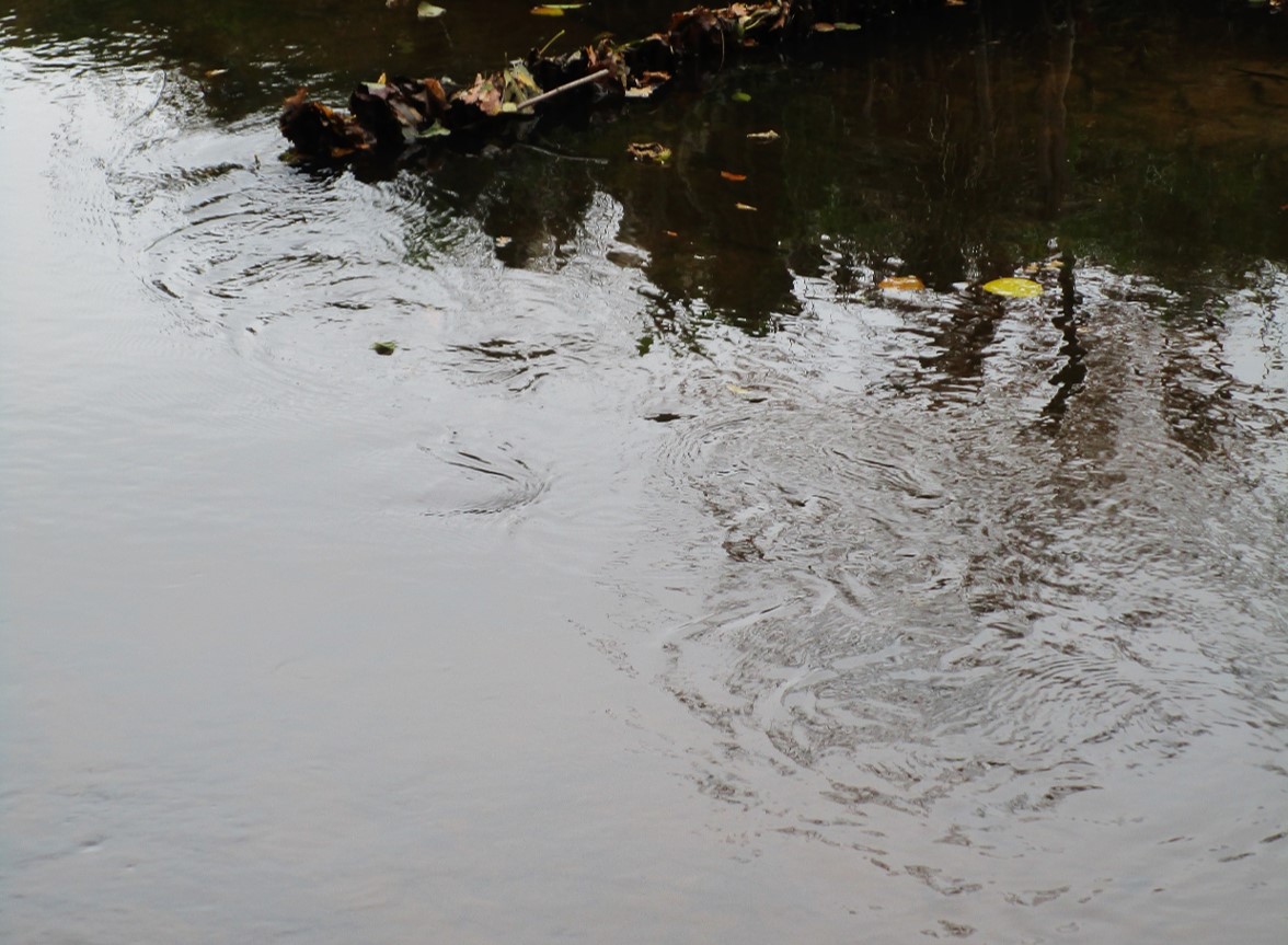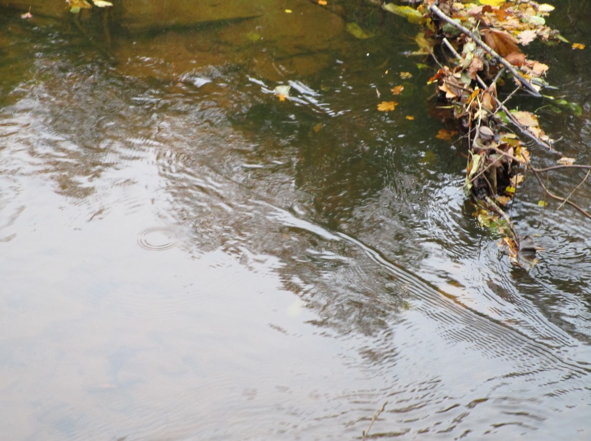 Detail Durchstrom – „gut Herbstlaub“ treibt an, bachab zeigt sich wie im vorigen Foto die charakteristische Kleinturbulenz.