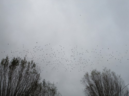 Tja, und dann – über der Marsch, dicht vor dem Geesthang (wo ebenfalls zahlreich AltEichen stehen [zu sehen sind Weiden der Marsch]) – noch ein großer Schwarm. – – – Was ist das?!
