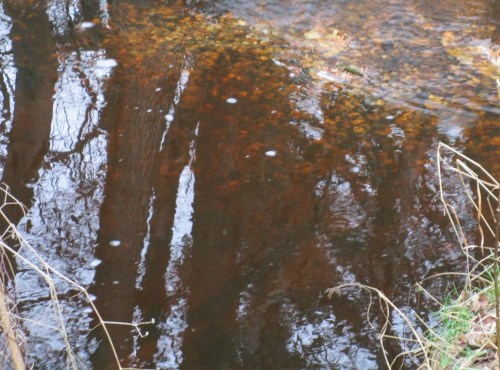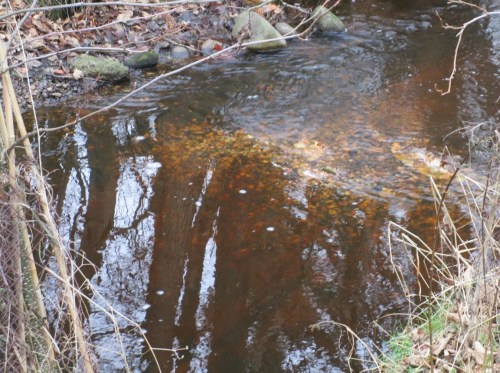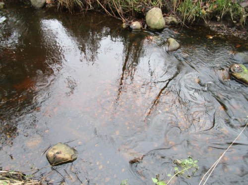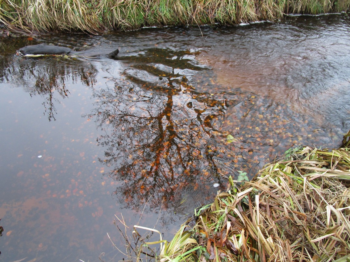 Da ich geschützt hinter einem Baum stehe, kann es gut sein, dass einer der großen Laicher im Foto erfasst wurde, während die anderen in Uferverstecke verschwanden.