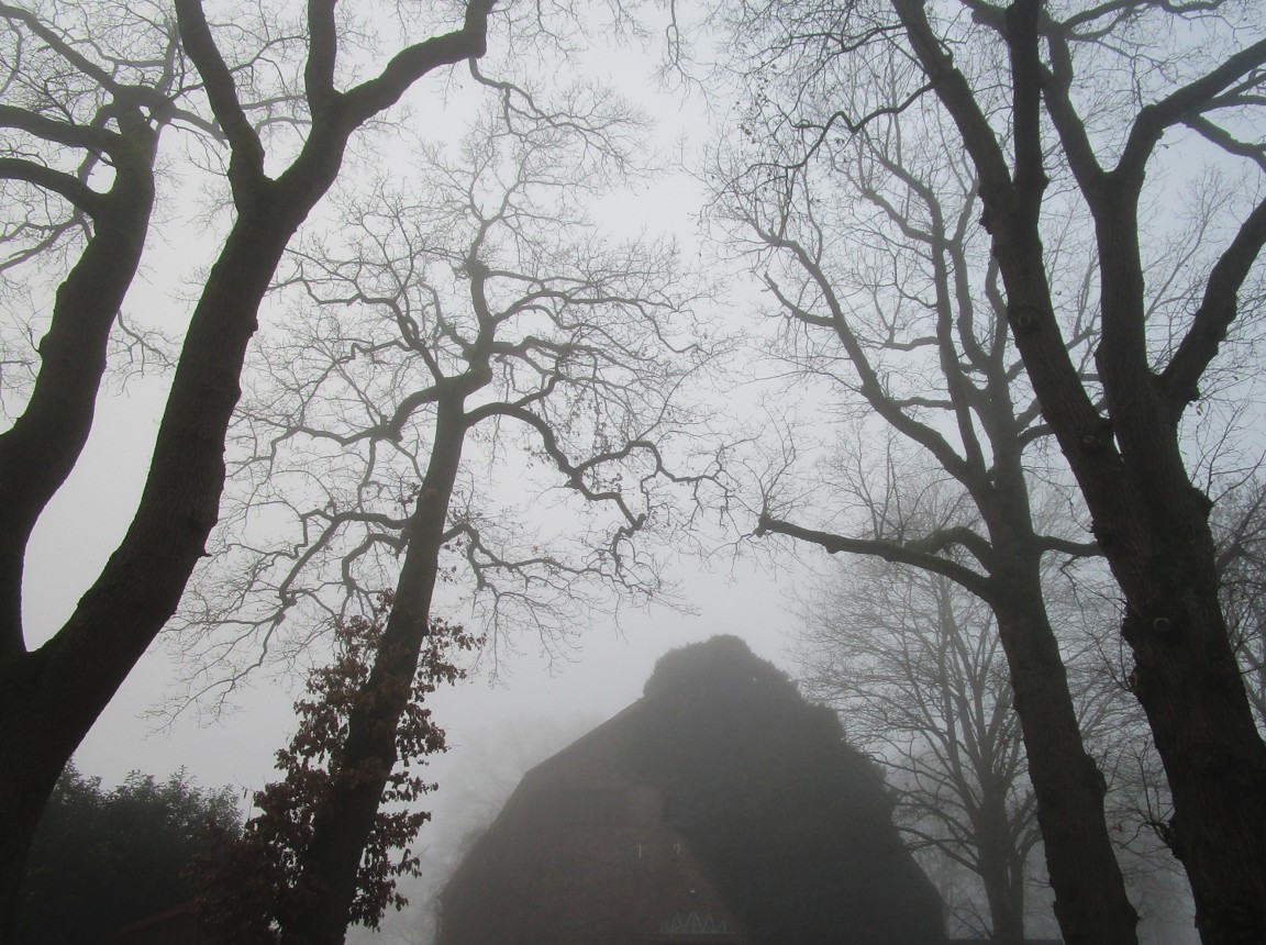 AltEichenAllee und Efeu-bekränztes Stallgebäude Idenburg – ob der Storch das Nest droben schon wieder im 2., gar 1. Monat des kommenden Jahres beziehen wird?