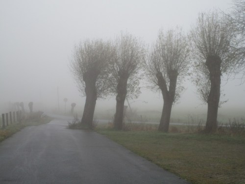 Fast wie Fahrrinnen- oder Wanderwegpricken im Watt – die Stock-gestützten Jungbäume der Alleeerneuerung gen Idenburg.