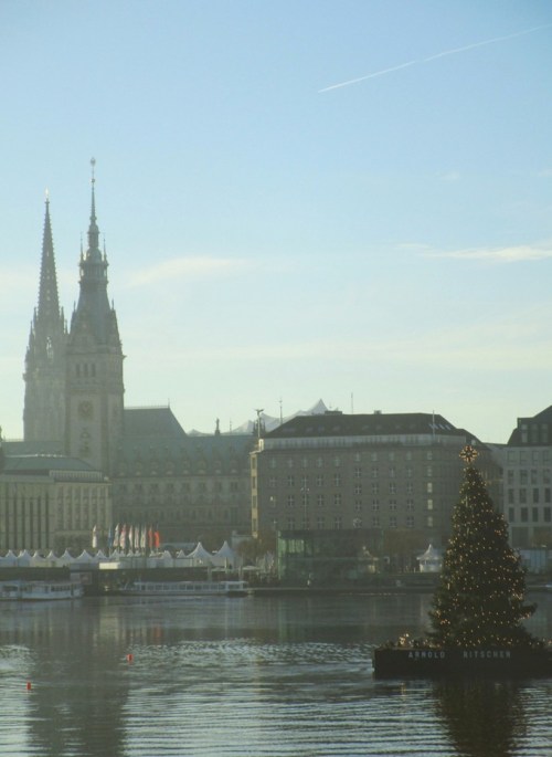 Und schon sind wir – mit Startschwierigkeiten und Verzögerung – unterwegs, vorbei an der Alstertanne und dem Hamburger Rathaus.