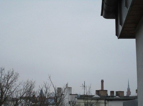 Als wir über den Dächern von Berlin gelandet sind, ist der Dies dick runtergekommen – den Fernsehturm sehen wir erstmal nicht mehr.