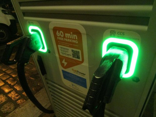 Der Parkplatz ist – bei ständigem Wechsel – proppevoll – – – die Ladesäulen nicht! So laden wir also.