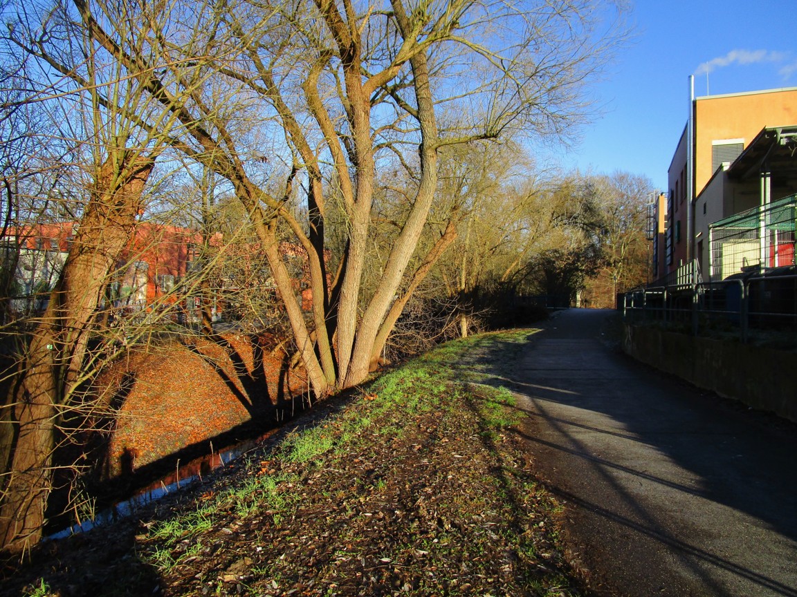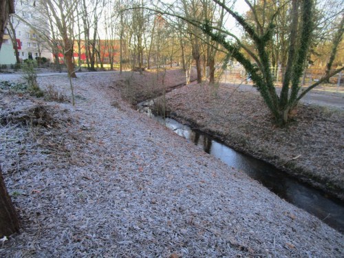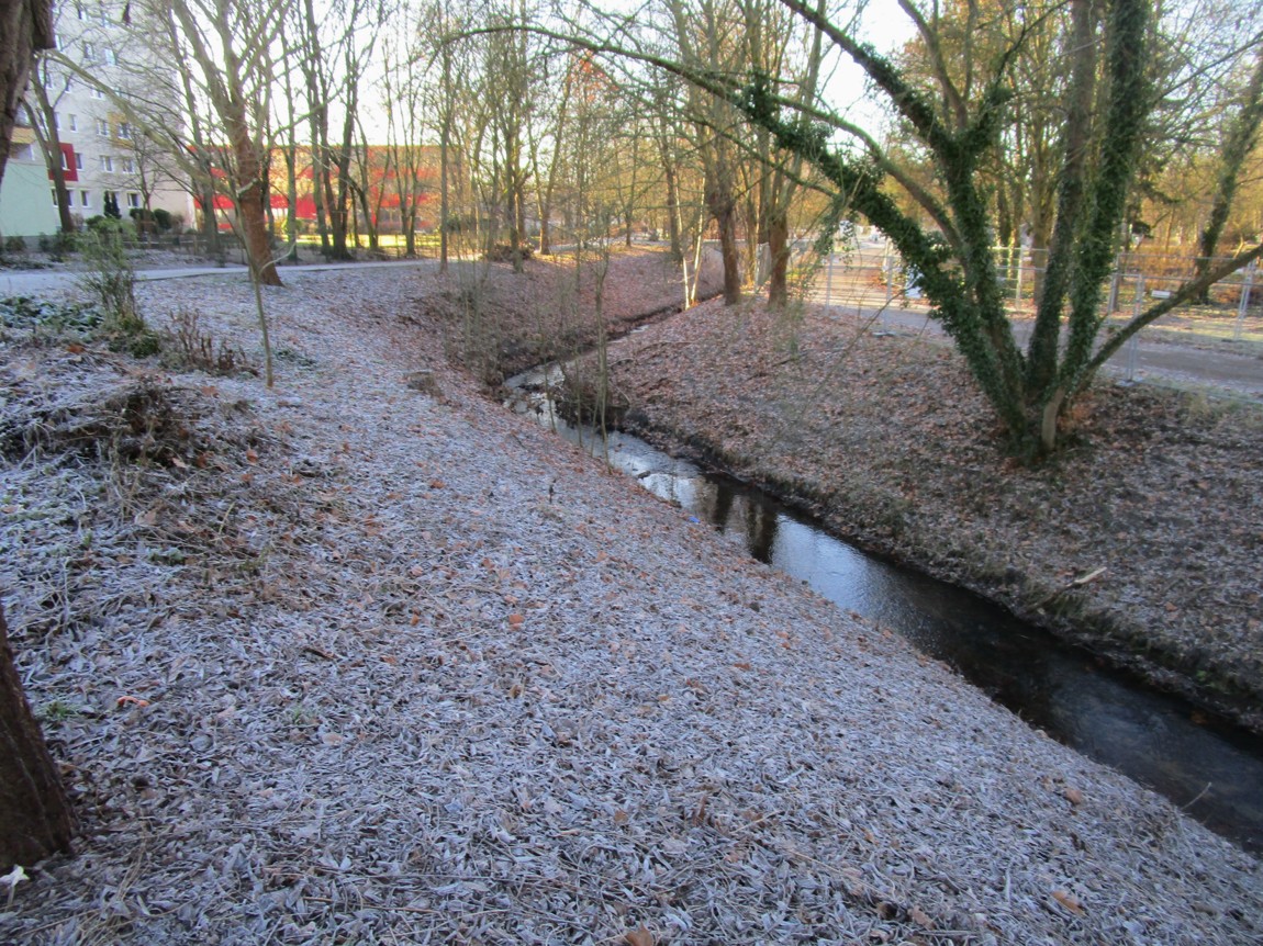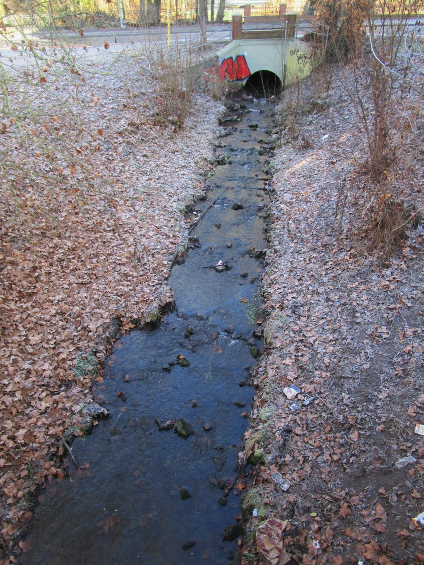 Von geeigneter Parkgelegenheit kommen wir südlich Schlosspark Buch an den Stadtbach Panke, Berlin, heran – Canyon-artig ausgestaltet, ein öder Lebensraum.