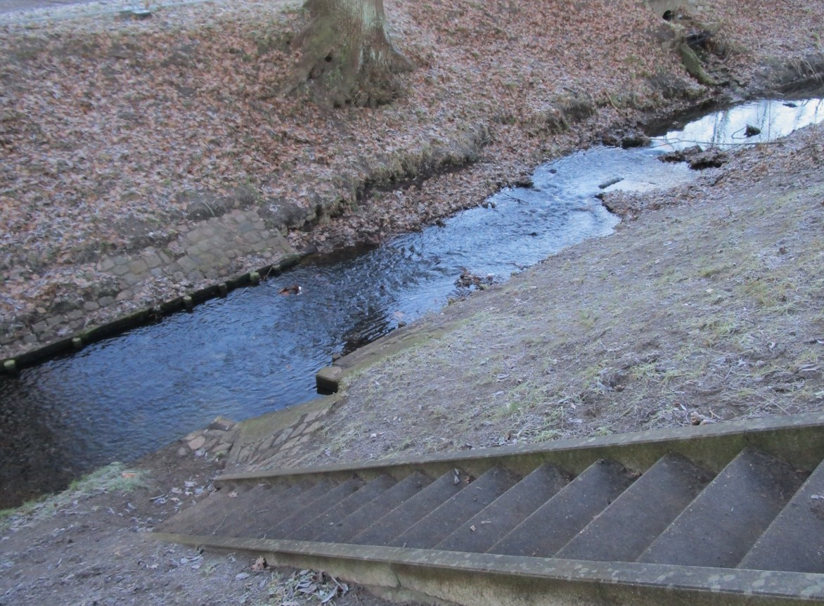 Steiltreppe, Pflasterungen, tiefe Einleitung – hier soll demnächst die Gewässerverbesserung Panke weitergehen.