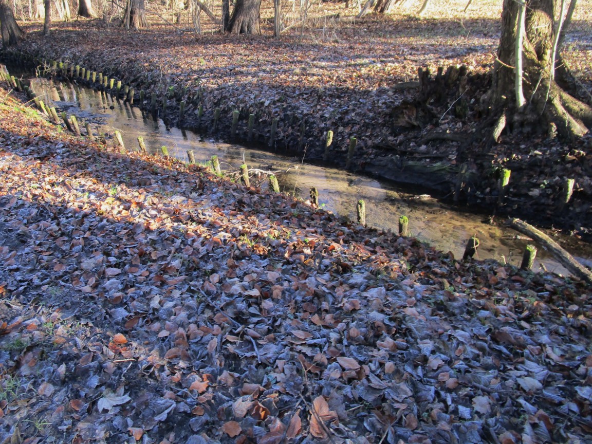 Schatten, Spiegelung, Faschinenreste – auch solch vergehendes Altholz kann gleichzeitig Kultur“Denk-Mal!“ und Lebensraum darstellen.