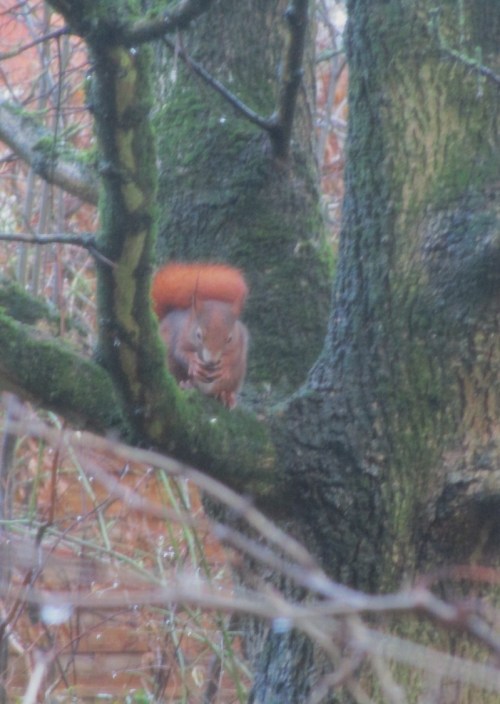 … angesichts Sturms und zeitweisen Regens mit Wärmedecke und Regenschutz den Rücken bedeckend, widmet sich seiner Morgennuss.