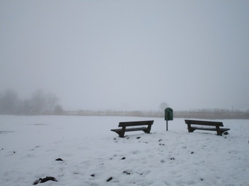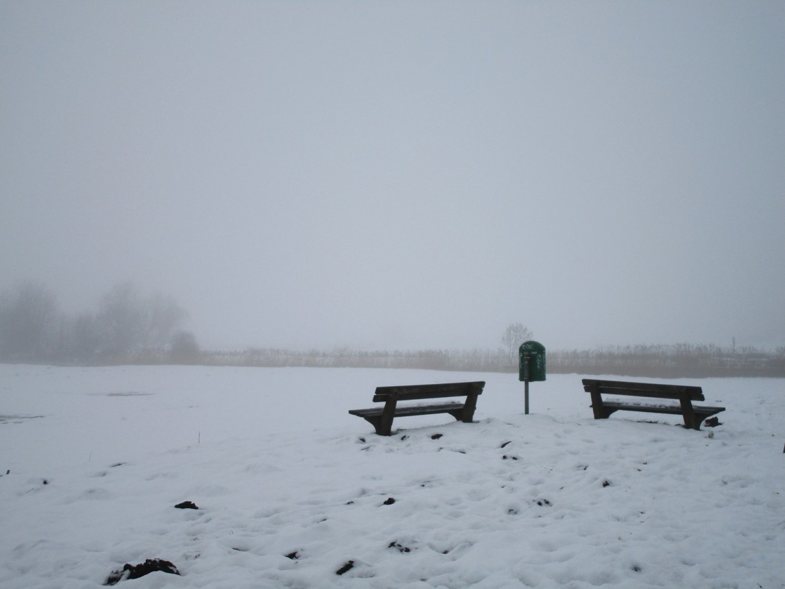 Blick von der Deichlinie in die Marsch – ich bin sicher, sie ist da irgendwo, im weissgrauen Nirwana.