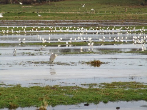 Vorbei an den Lachmöwen, den Anstieg Geesthang im Sinn – der Graureiher vorn nimmt keine Kenntnis von mir, wirkt apathisch.
