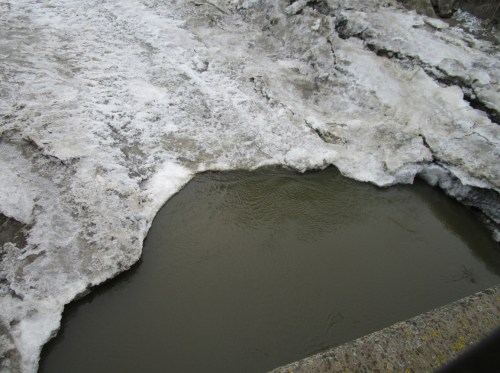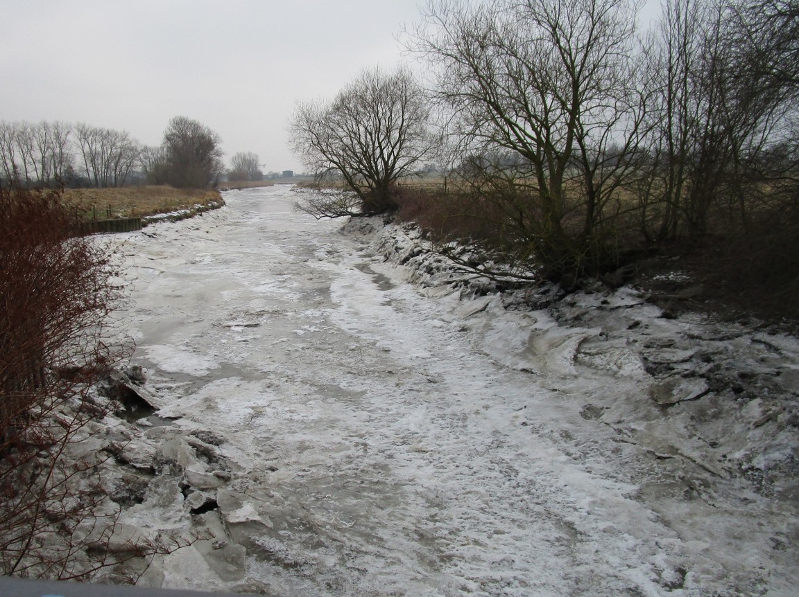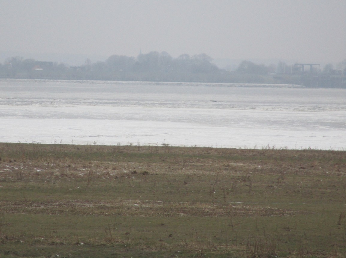 Queren der Binnenelbe beim Anradeln Elbdeich Fährmannssand, gen Tideniedrigwasser (angesichts Ost 4 und geringem Abfluss der Elbe resultiert ein Tnw-Minus von 1,5 m [Paradox?: Erhöhen des Tidehubs durch „Verlust“ des Ebbewasserstands]) – Richtung Sturmflutsperrwerk alles mit Eis zu.