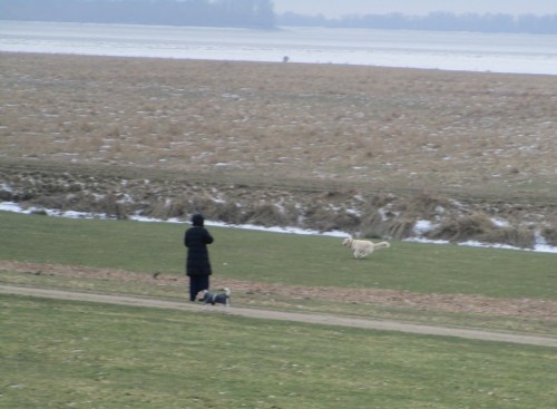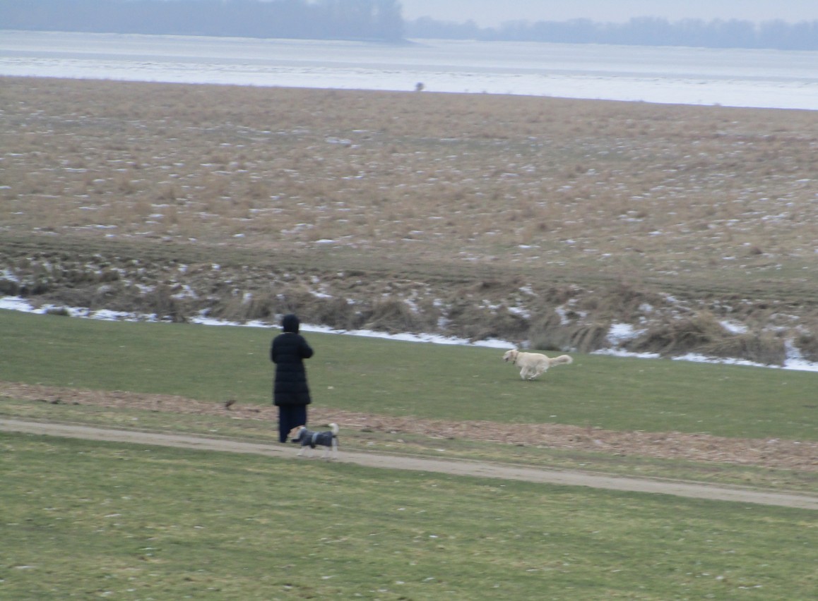 Elbdeich Fährmannssand – Hunde Führende sind gut verpackt, nehmen ihr Umfeld kaum wahr. „Selbstverständlich“ laufen Hunde „als Teil der Natur“ frei. Schutz der Tierwelt in harter Zeit, auch das Anleingebot am Deich interessieren nicht.
