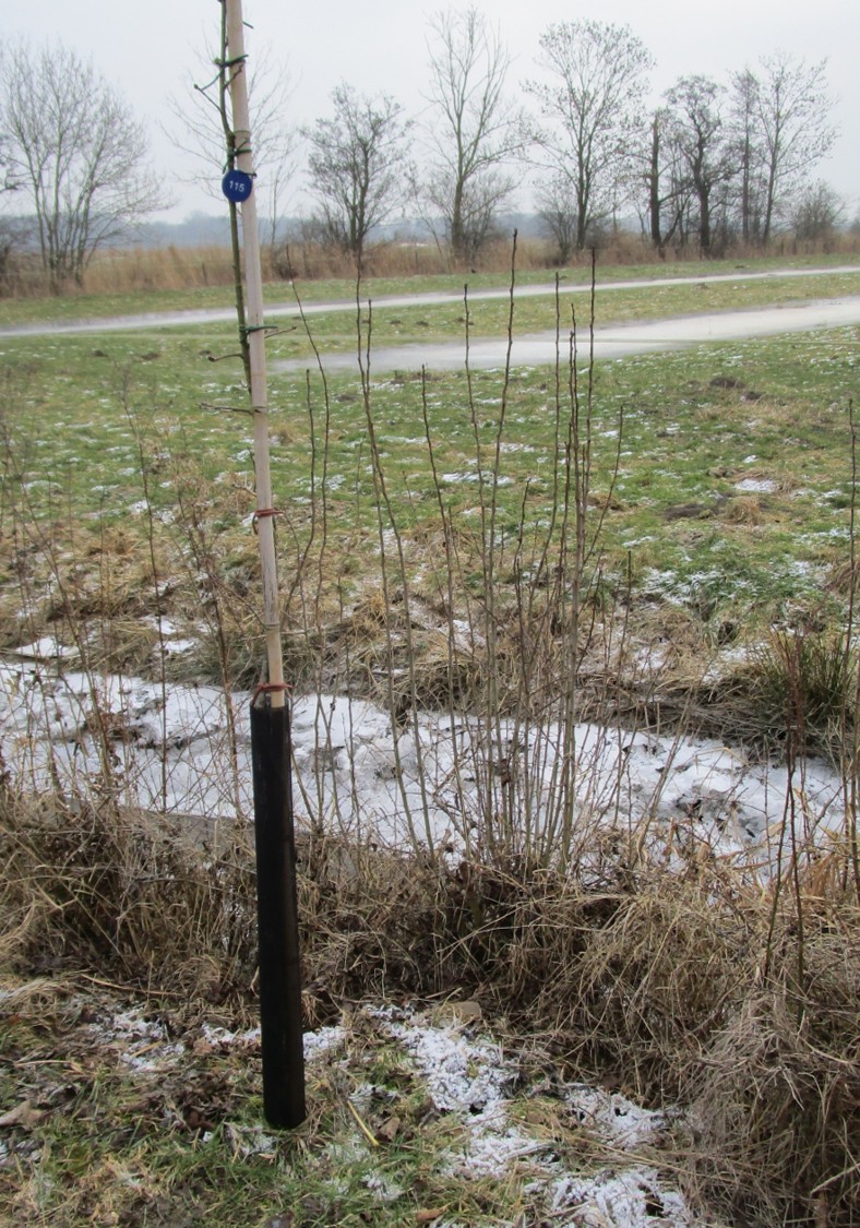 Mit Rückenwind entlang des Deichs, dann nordwärts quer Richtung Hetlingen und nun, seit geraumer Zeit im wind chill-Gegenwind und wieder quer dazu Idenburg passierend – die junge Alleepflanzung hat Fraß- und Fegeschutz erhalten.