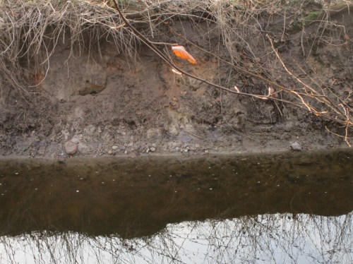 Durch die heftige Störung des Bodenwasserhaushalts wird hier erheblich Eisen eingetragen, das durch die neuen Rauigkeiten bachab nun schnell ausgeflockt niedergeschlagen wird (das Rostrote links – rechts fliesst ebenfalls glasklares Wasser, dort über algenbewachsenen, im Foto fast schwarz erscheinenden Kies).