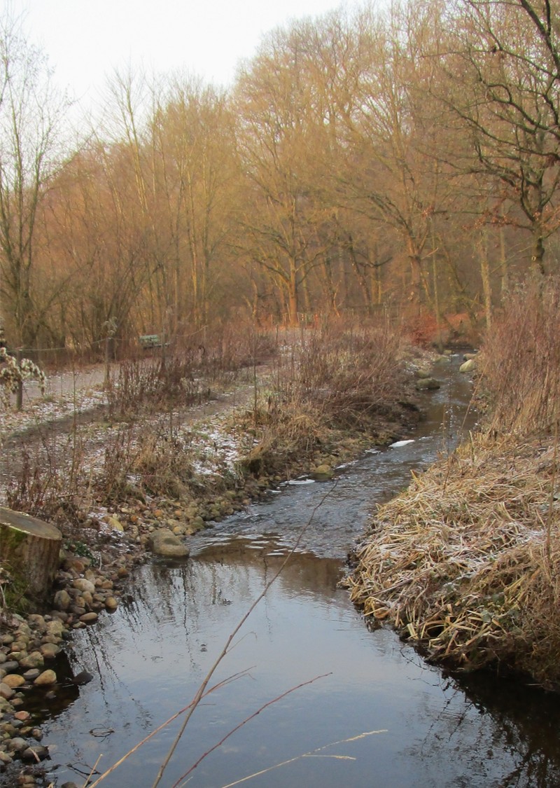 Diesen fast ins Schwarz-Weiss abgleitenden Aspekt ersetze ich im Folgenden durch die Fortsetzung meiner Moorbekwanderung – jetzt nach Wiesenstrecke entlang des Waldrands.