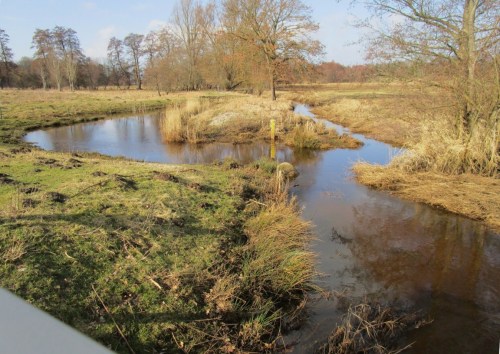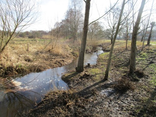 Die Ufer sind gemäht, Weiden bestimmen das Bild. Charakteristischerweise stünden hier am nassen Bachufer Erlen.