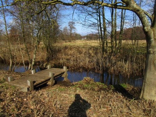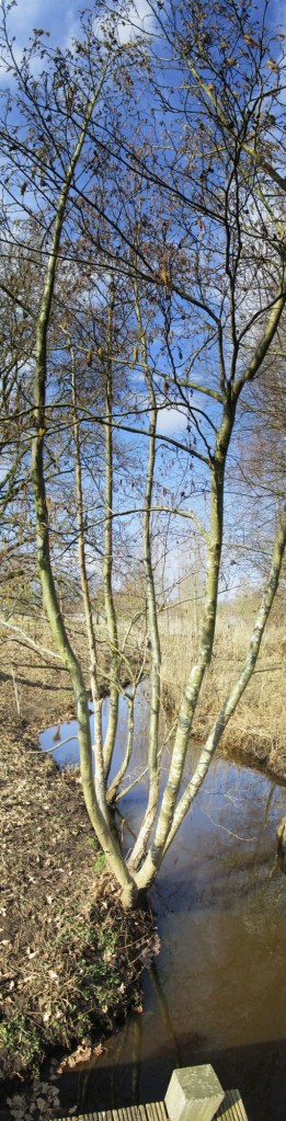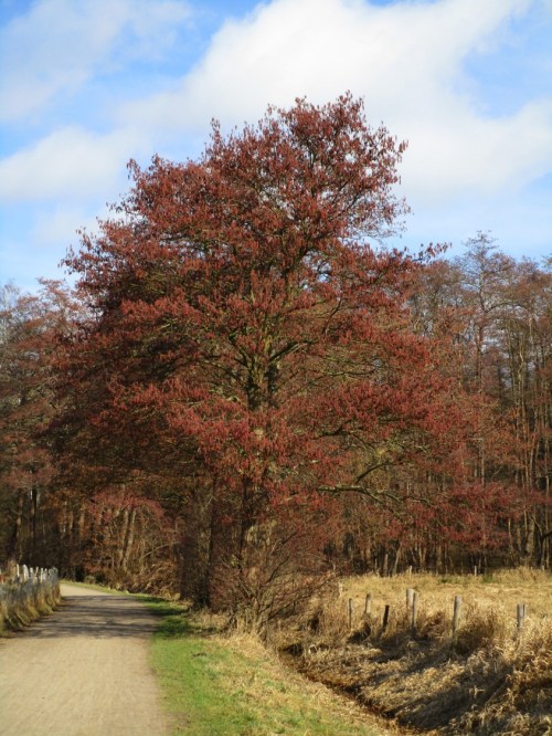 Auf der Brücke westlich des Wassererlebnisbereichs Wedeler Au blicke ich gen Norden – rot leuchten die inzwischen weit entwickelten, langgestreckten Lämmerschwänzchen einer frei stehende Erle.