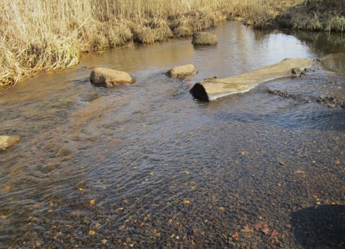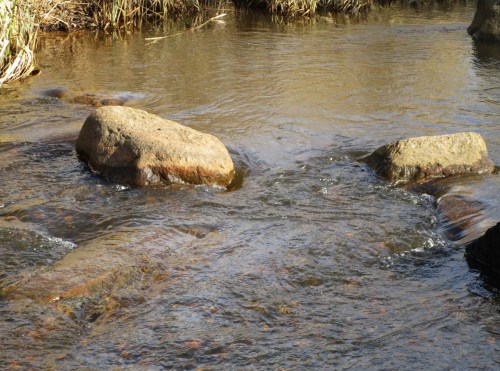 … im Jahresgang wechselnder Wasserführung zusammen mit Findlingen und Baumstämmen attraktive Turbulenzbilder zu erzeugen.