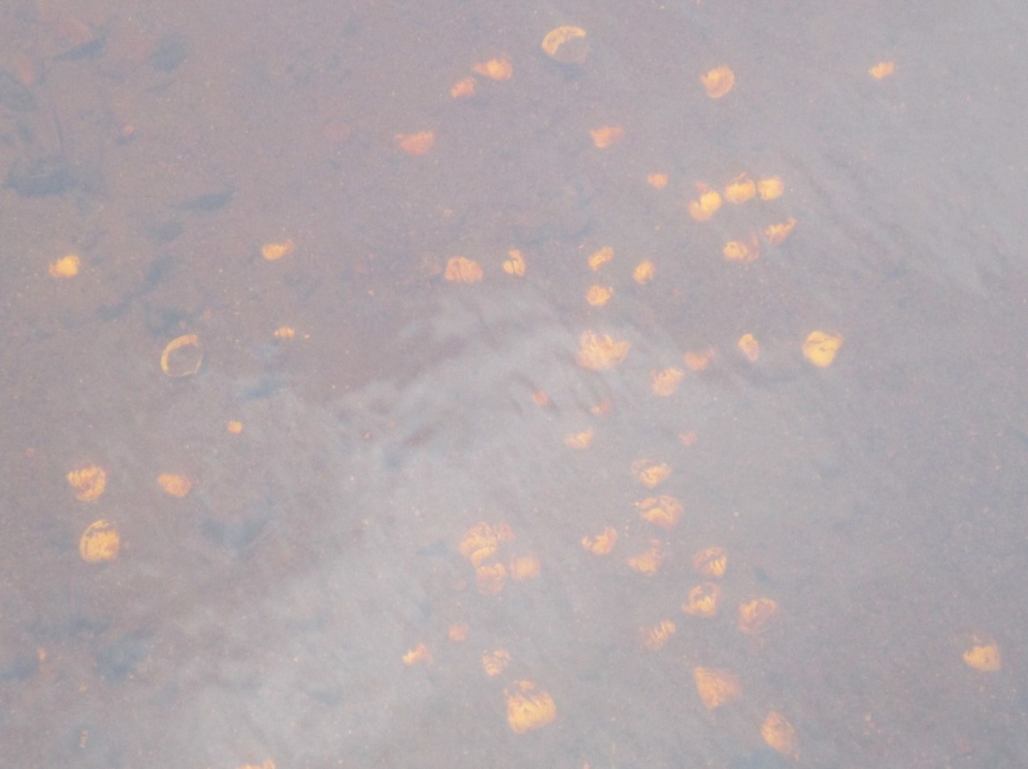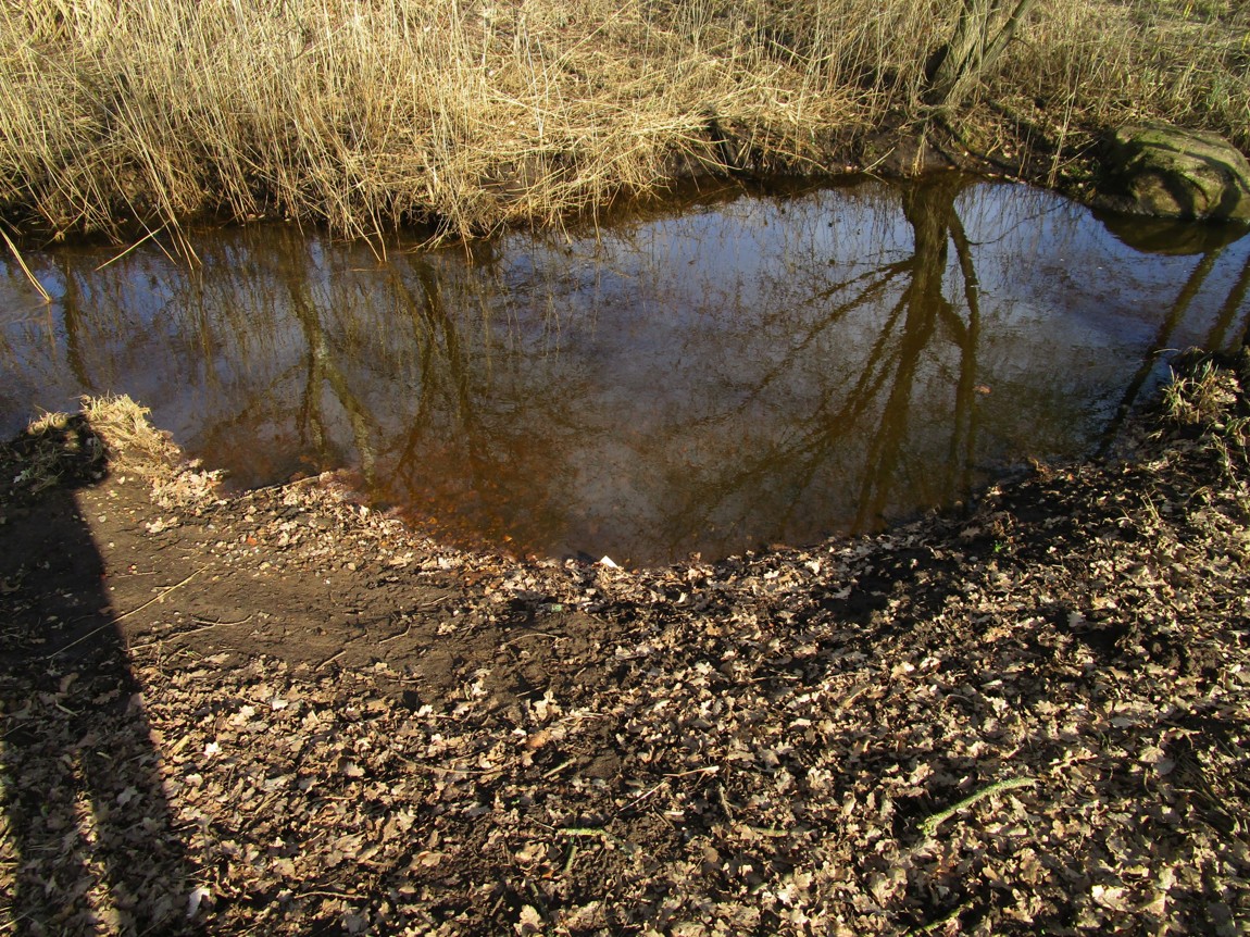 Das muss ich gelegentlich näher untersuchen – Muschelschalen liegen auf dem Sediment. Ob es sich um kürzlich erfrorene Körbchenmuscheln handelt? Oder wer hat hier einen kurzen Snack eingelegt? (Im Vorjahr lagen hier ähnlich auffällig hell leuchtende Kiesel, von aktivem Viehzeuch offenbar auf Nahrungssuche umgedreht, freigelegt.)