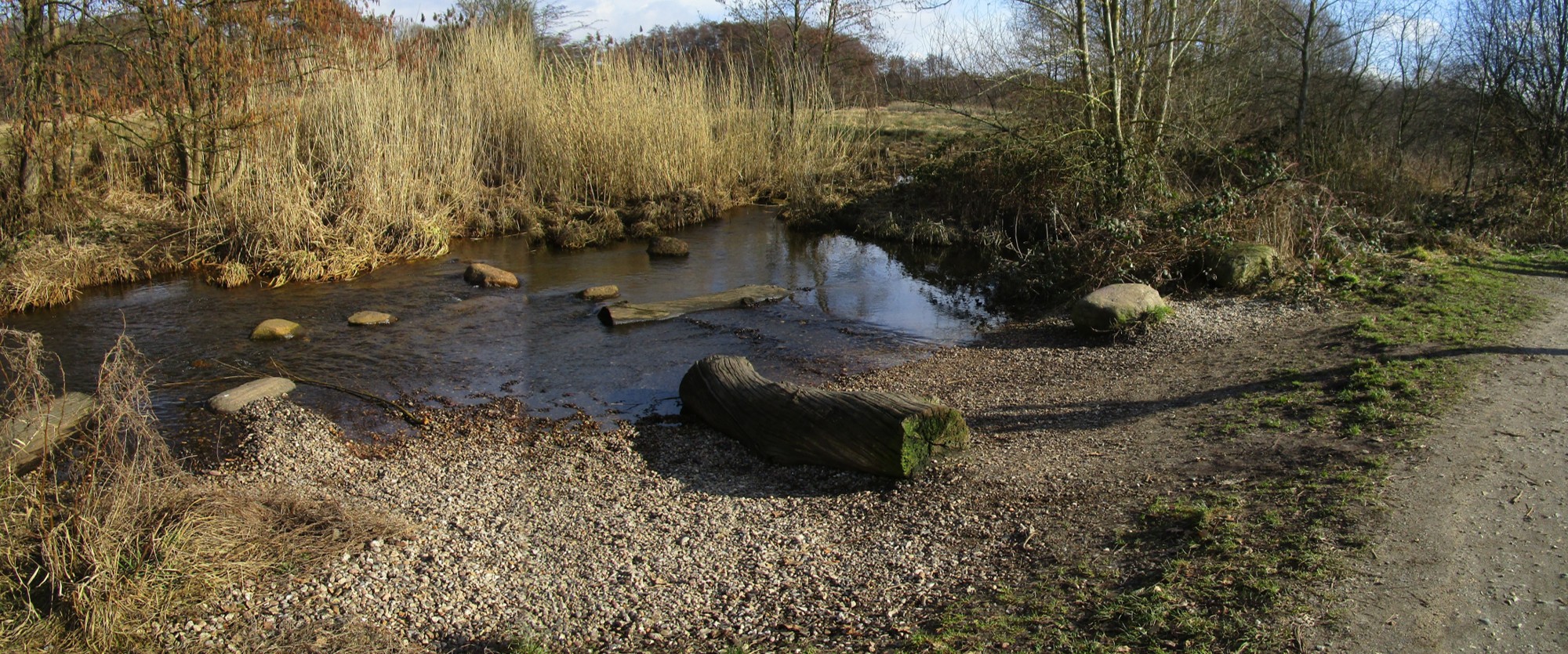 … im Jahresgang wechselnder Wasserführung zusammen mit Findlingen und Baumstämmen attraktive Turbulenzbilder zu erzeugen.