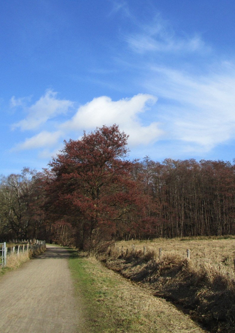 Auf der Brücke westlich des Wassererlebnisbereichs Wedeler Au blicke ich gen Norden – rot leuchten die inzwischen weit entwickelten, langgestreckten Lämmerschwänzchen einer frei stehende Erle.