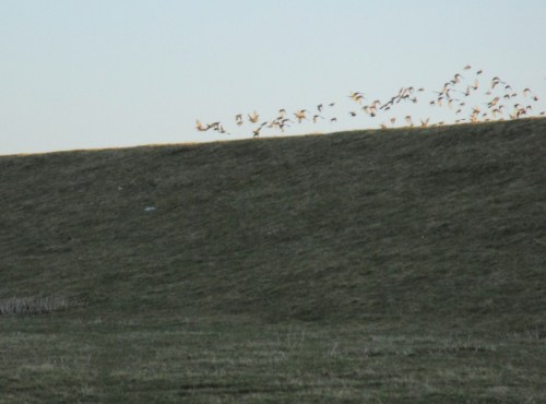 Eine um die 150er Gruppe Stare flog kleine Formationen flach über Grund, ruhte dann auf der Deichkrone. Spontaner Neustart lässt nur Unschärfe beim Fotografieren im Vorbeiradeln zu.