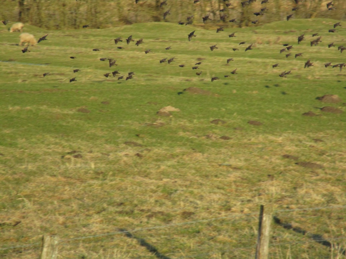 Eine um die 150er Gruppe Stare flog kleine Formationen flach über Grund, ruhte dann auf der Deichkrone. Spontaner Neustart lässt nur Unschärfe beim Fotografieren im Vorbeiradeln zu.