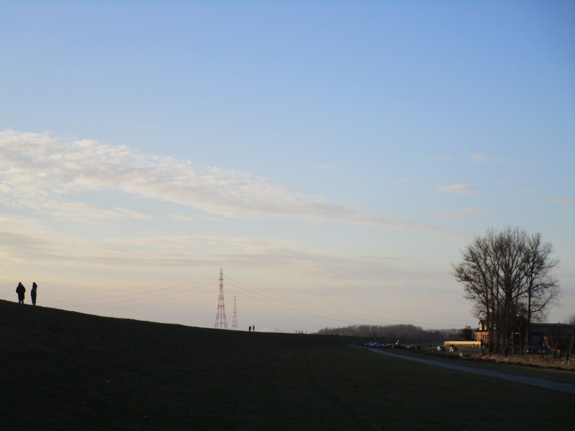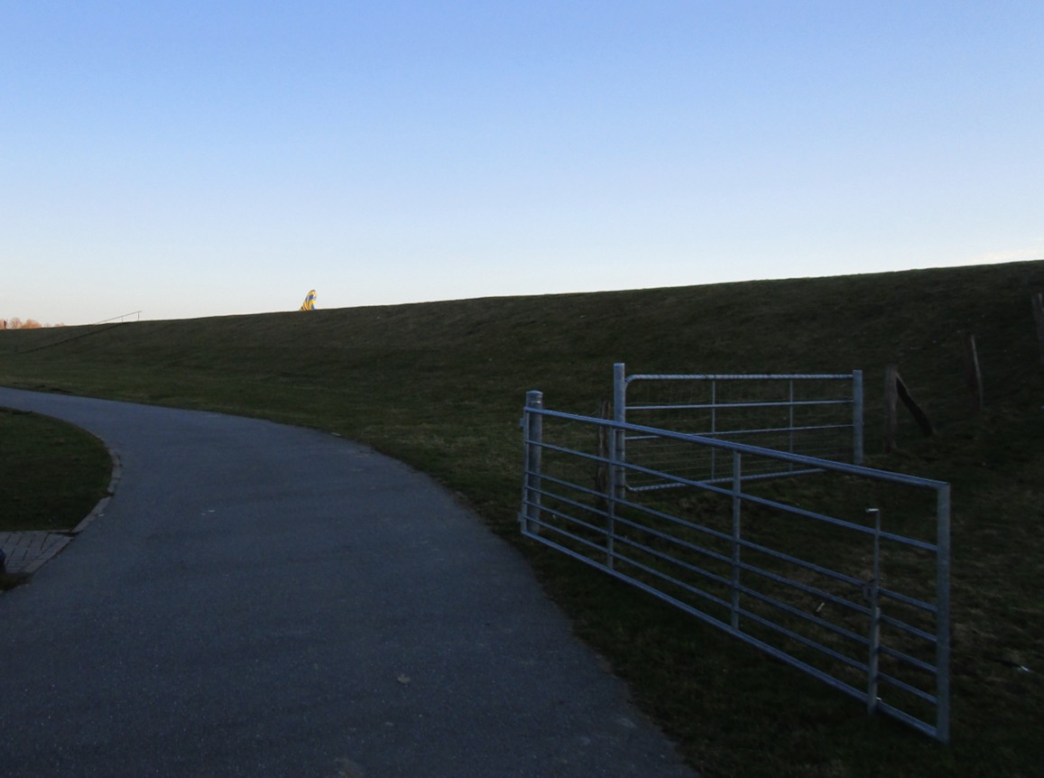 Sonnenuntergangs-Spotter auf dem Deich. – Der Drachen ist weg, wird wohl eingepackt, nachdem die Seile im Wind sortiert wurden.