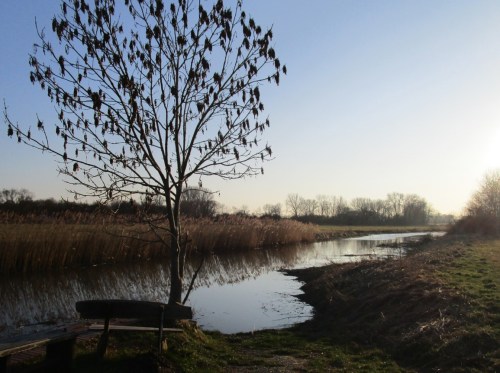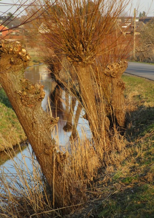 Nach ruhiger Marschrunde biege ich Richtung Geesthang ab – spiegelnde Kopfweidenreihe per Durchblick durch zwei.