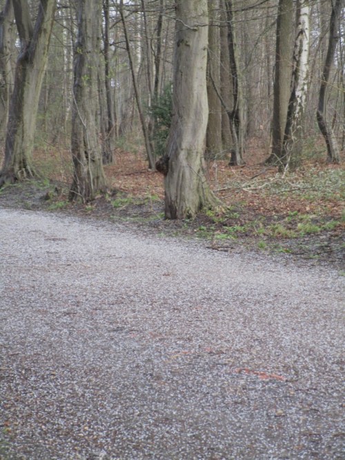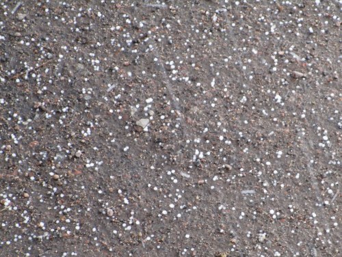 Am Vorabend hatten wir noch vom Wetterfrosch gelernt, was den Unterschied zwischen Graupel und Hagel ausmacht. Ersterer schmilzt schnellstens, wenn man ein Korn in die Finger nimmt. So ist das auch, ich wundere mich, mit der weissen Lage auf dem Weg, trotz Temperatur nur gering über null Grad. Schon ist sie weg.