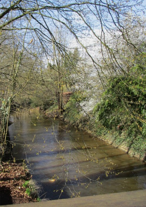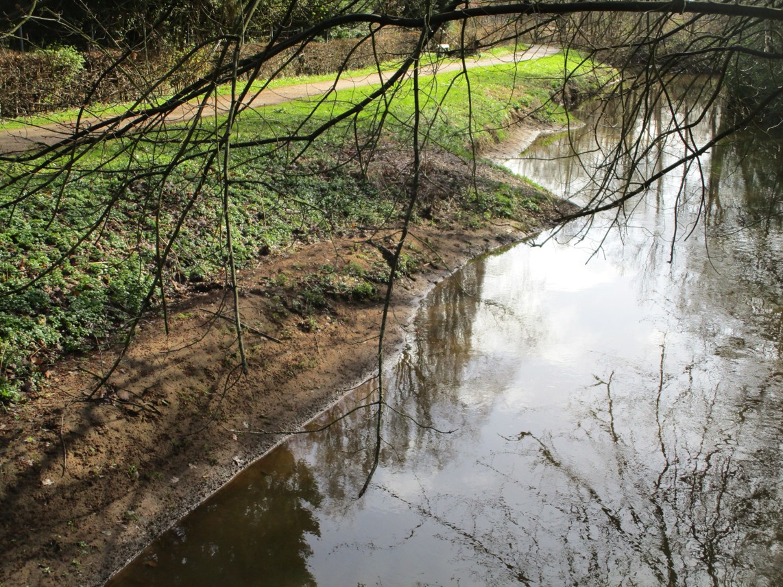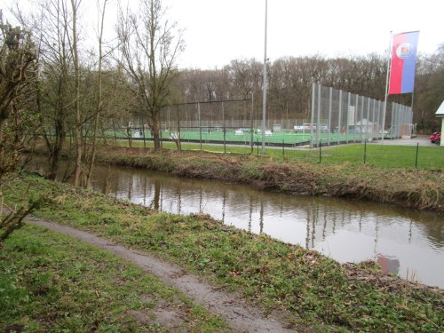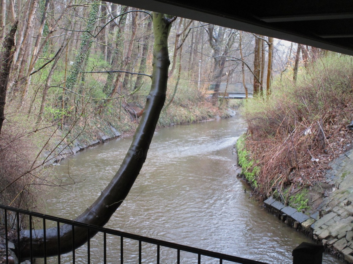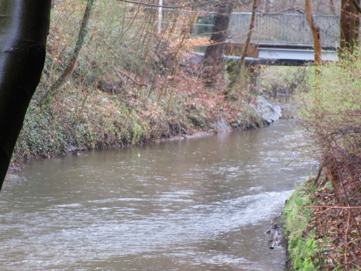 Unter der Bahn, vor dem Stadtwald Fahlt – Blick bachauf auf Rausche auf dem Nacken und scharfe Schussstrecke.